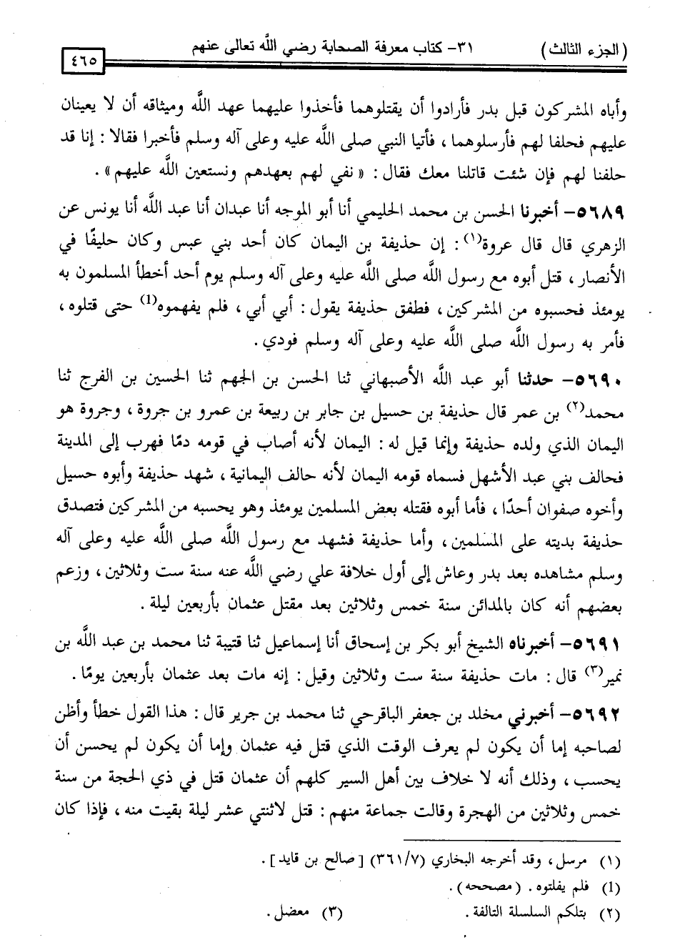 5691 - أَخْبَرْنَاهُ الشَّيْخُ أَبُو بَكْرِ بْنُ إِسْحَاقَ ، أَنَا إِسْمَاعِيلُ ، ثَنَا قُتَيْبَةُ ، ثَنَا مُحَمَّدُ بْنُ عَبْدِ اللَّهِ بْنِ نُمَيْرٍ ، قَالَ: " مَاتَ حُذَيْفَةُ سَنَةَ سِتٍّ وَثَلَاثِينَ وَقِيلَ: إِنَّهُ مَاتَ بَعْدَ عُثْمَانَ بِأَرْبَعِينَ يَوْمًا "