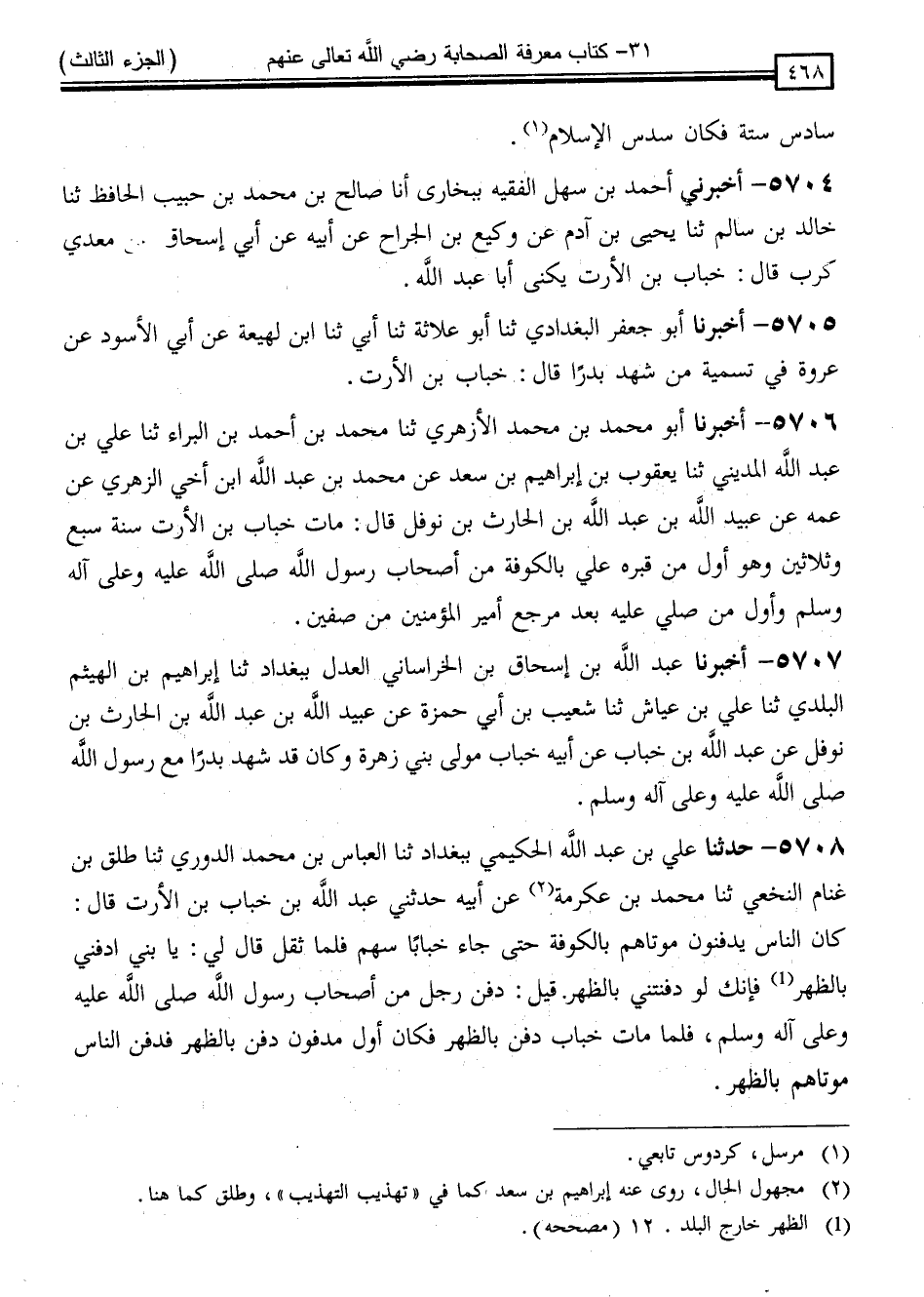 5706 - أَخْبَرَنَا أَبُو مُحَمَّدِ [الْحَسَنُ] بْنُ مُحَمَّدٍ الْأَزْهَرِيُّ ، ثَنَا مُحَمَّدُ بْنُ أَحْمَدَ بْنِ الْبَرَاءِ ، ثَنَا عَلِيُّ بْنُ عَبْدِ اللَّهِ الْمَدِينِيُّ ، ثَنَا يَعْقُوبُ بْنُ إِبْرَاهِيمَ بْنِ سَعْدٍ ، عَنْ مُحَمَّدِ بْنِ عَبْدِ اللَّهِ ابْنِ أَخِي الزُّهْرِيِّ ، عَنْ عَمِّهِ ، عَنْ عُبَيْدِ اللَّهِ بْنِ عَبْدِ اللَّهِ بْنِ الْحَارِثِ بْنِ نَوْفَلٍ قَالَ: " مَاتَ خَبَّابُ بْنُ الْأَرَتِّ سَنَةَ سَبْعٍ وَثَلَاثِينَ ، وَهُوَ أَوَّلُ مَنْ قَبَرَهُ عَلَيٌّ بِالْكُوفَةِ مِنْ أَصْحَابِ رَسُولِ اللَّهِ صَلَّى اللَّهُ عَلَيْهِ وَسَلَّمَ ، وَأَوَّلُ مَنْ صَلَّى عَلَيْهِ بَعْدَ مَرْجِعِ أَمِيرِ الْمُؤْمِنِينَ مِنْ صِفِّينَ
