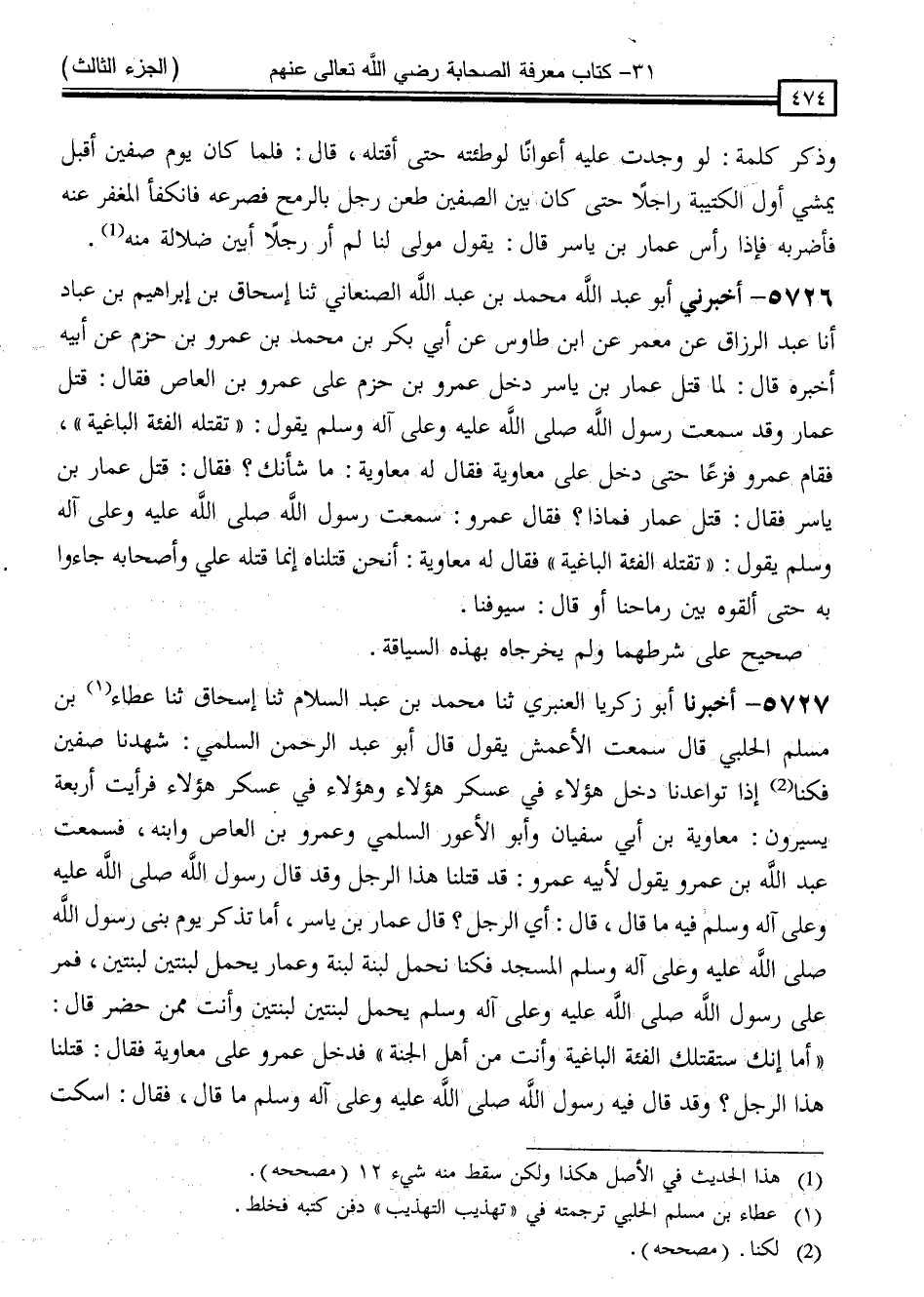 5727 - أَخْبَرَنَا أَبُو زَكَرِيَّا الْعَنْبَرِيُّ ، ثَنَا مُحَمَّدُ بْنُ عَبْدِ السَّلَامِ ، ثَنَا إِسْحَاقُ ، ثَنَا عَطَاءُ بْنُ مُسْلِمٍ الْحَلَبِيُّ قَالَ: سَمِعْتُ الْأَعْمَشَ يَقُولُ: قَالَ أَبُو عَبْدِ الرَّحْمَنِ السُّلَمِيُّ: شَهِدْنَا صِفِّينَ فَكُنَّا إِذَا تَوَاعَدْنَا دَخَلَ هَؤُلَاءِ فِي عَسْكَرِ هَؤُلَاءِ ، وَهَؤُلَاءِ فِي عَسْكَرِ هَؤُلَاءِ ، فَرَأَيْتُ أَرْبَعَةً يَسِيرُونَ: مُعَاوِيَةُ بْنُ أَبِي سُفْيَانَ ، وَأَبُو الْأَعْوَرِ السُّلَمِيُّ ، وَعَمْرُو بْنُ الْعَاصِ وَابْنُهُ فَسَمِعْتُ عَبْدَ اللَّهِ بْنَ عَمْرٍو يَقُولُ لِأَبِيهِ عَمْرٍو: قَدْ قَتَلْنَا هَذَا الرَّجُلَ ، وَقَدْ قَالَ رَسُولُ اللَّهِ صَلَّى اللَّهُ عَلَيْهِ وَسَلَّمَ فِيهِ مَا قَالَ: قَالَ: أَيُّ الرَّجُلِ ؟ قَالَ: عَمَّارُ بْنُ يَاسِرٍ أَمَا تَذْكُرُ يَوْمَ بَنَى رَسُولُ اللَّهِ صَلَّى اللَّهُ عَلَيْهِ وَسَلَّمَ الْمَسْجِدَ ، فَكُنَّا نَحْمِلُ لَبِنَةً لَبِنَةً ، وَعَمَّارٌ يَحْمِلُ لَبِنَتَيْنِ لَبِنَتَيْنِ ، فَمَرَّ عَلَى رَسُولِ اللَّهِ صَلَّى اللَّهُ عَلَيْهِ وَسَلَّمَ يَحْمِلُ لَبِنَتَيْنِ لَبِنَتَيْنِ وَأَنْتَ مِمَّنْ حَضَرَ ، قَالَ: " أَمَا إِنَّكَ سَتَقْتُلُكَ الْفِئَةُ الْبَاغِيَةُ ، وَأَنْتَ أَهْلُ الْجَنَّةِ " فَدَخَلَ عَمْرٌو عَلَى مُعَاوِيَةَ ، فَقَالَ: قَتَلْنَا هَذَا الرَّجُلَ ، وَقَدْ قَالَ فِيهِ رَسُولُ اللَّهِ صَلَّى اللَّهُ عَلَيْهِ وَسَلَّمَ مَا قَالَ ، فَقَالَ: اسْكُتْ -[475]- فَوَاللَّهِ مَا تَزَالُ تَرْحَضُ فِي بَوْلِكَ ، أَنَحْنُ قَتَلْنَاهُ إِنَّمَا قَتَلَهُ عَلِيٌّ وَأَصْحَابُهُ جَاءُوا بِهِ حَتَّى أَلْقَوْهُ بَيْنَنَا
