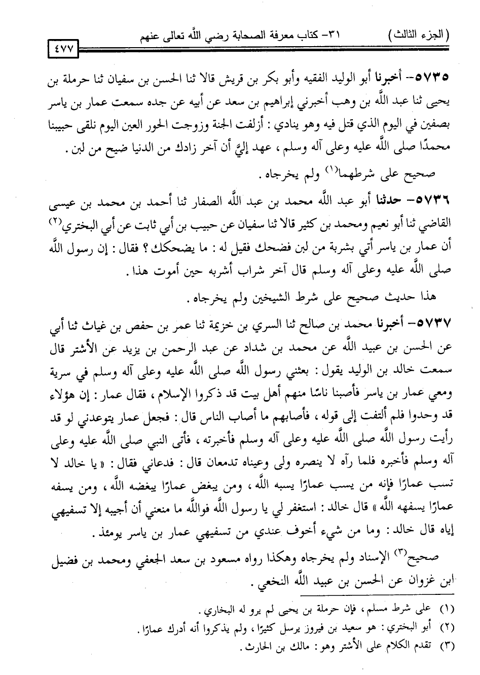 5735 - أَخْبَرَنَا أَبُو الْوَلِيدِ الْفَقِيهُ ، وَأَبُو بَكْرِ بْنُ قُرَيْشٍ قَالَا: ثَنَا الْحَسَنُ بْنُ سُفْيَانَ ، ثَنَا حَرْمَلَةُ بْنُ يَحْيَى ، ثَنَا عَبْدُ اللَّهِ بْنُ وَهْبٍ ، أَخْبَرَنِي إِبْرَاهِيمُ بْنُ سَعْدٍ ، عَنْ أَبِيهِ ، عَنْ جَدِّهِ ، سَمِعْتُ عَمَّارَ بْنَ يَاسِرٍ ، بِصِفِّينَ فِي الْيَوْمِ الَّذِي قُتِلَ فِيهِ ، وَهُوَ يُنَادِي: " أُزْلِفَتِ الْجَنَّةُ ، وَزُوِّجَتِ الْحُورُ الْعَيْنُ ، الْيَوْمَ نَلْقَى حَبِيبَنَا مُحَمَّدًا صَلَّى اللَّهُ عَلَيْهِ وَسَلَّمَ عَهِدَ إِلَيَّ أَنَّ آخِرَ زَادَكَ مِنَ الدُّنْيَا ضَيْحٌ مِنْ لَبَنٍ "