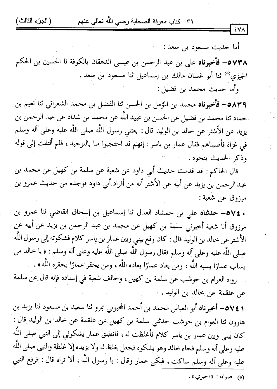 5740 - حَدَّثَنَاهُ عَلِيُّ بْنُ حَمْشَاذَ الْعَدْلُ ، ثَنَا إِسْمَاعِيلُ بْنُ إِسْحَاقَ الْقَاضِي ، ثَنَا عَمْرُو بْنُ مَرْزُوقٍ ، أَنَا شُعْبَةُ ، أَخْبَرَنِي سَلَمَةُ بْنُ كُهَيْلٍ ، عَنْ مُحَمَّدِ بْنِ عَبْدِ الرَّحْمَنِ بْنِ يَزِيدَ ، عَنْ أَبِيهِ ، عَنِ الْأَشْتَرِ ، عَنْ خَالِدِ بْنِ الْوَلِيدِ قَالَ: كَانَ وَقَعَ بَيْنِي وَبَيْنَ عَمَّارِ بْنِ يَاسِرٍ كَلَامٌ ، فَشَكَوْتُهُ إِلَى رَسُولِ اللَّهِ صَلَّى اللَّهُ عَلَيْهِ وَسَلَّمَ ، فَقَالَ رَسُولُ اللَّهِ صَلَّى اللَّهُ عَلَيْهِ وَسَلَّمَ: " يَا خَالِدُ ، مَنْ يُسَابَّ عَمَّارًا يَسُبَّهُ اللَّهُ ، وَمَنْ يُعَادِ عَمَّارًا يُعَادِهِ اللَّهُ ، وَمَنْ يُحَقِّرْ عَمَّارًا يُحَقِّرْهُ اللَّهُ " رَوَاهُ الْعَوَّامُ بْنُ حَوْشَبٍ ، عَنْ سَلَمَةَ بْنِ كُهَيْلٍ ، " وَخَالَفَ شُعْبَةُ فِي إِسْنَادِهِ فَإِنَّهُ ، قَالَ: عَنْ سَلَمَةَ ، عَنْ عَلْقَمَةَ ، عَنْ خَالِدِ بْنِ الْوَلِيدِ "