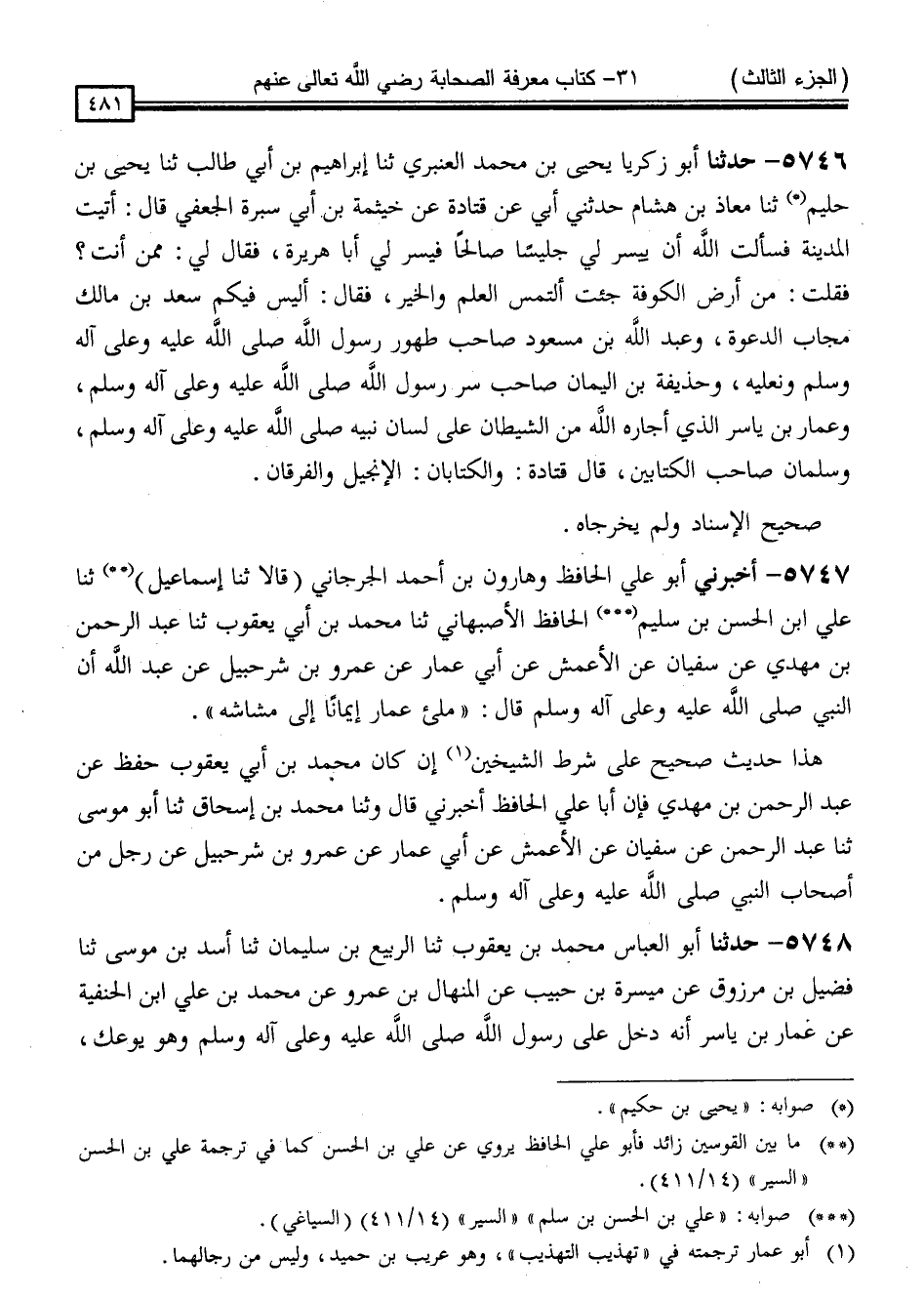 5747 - أَخْبَرَنِي أَبُو عَلِيٍّ الْحَافِظُ ، وَهَارُونُ بْنُ أَحْمَدَ الْجُرْجَانِيُّ ، قَالَا: ثَنَا إِسْمَاعِيلُ ، ثَنَا عَلِيُّ بْنُ الْحَسَنِ بْنِ سُلَيْمٍ الْحَافِظُ الْأَصْبَهَانِيُّ ، ثَنَا مُحَمَّدُ بْنُ أَبِي يَعْقُوبَ ، ثَنَا عَبْدُ الرَّحْمَنِ بْنُ مَهْدِيٍّ ، عَنْ سُفْيَانَ ، عَنِ الْأَعْمَشِ ، عَنْ أَبِي عَمَّارٍ ، عَنْ عَمْرِو بْنِ شُرَحْبِيلَ ، عَنْ عَبْدِ اللَّهِ ، أَنَّ النَّبِيَّ صَلَّى اللَّهُ عَلَيْهِ وَسَلَّمَ قَالَ: " مُلِئَ عَمَّارٌ إِيمَانًا إِلَى مُشَاشِهِ "