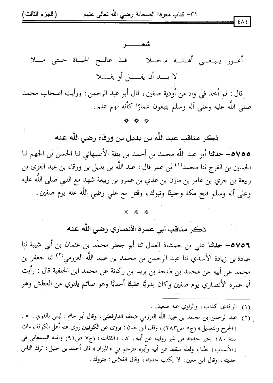 5755 - حَدَّثَنَا أَبُو عَبْدِ اللَّهِ مُحَمَّدُ بْنُ أَحْمَدَ بْنِ بُطَّةَ الْأَصْبَهَانِيُّ ، ثَنَا الْحَسَنُ بْنُ الْجَهْمِ ، ثَنَا الْحُسَيْنُ بْنُ الْفَرَجِ ، ثَنَا مُحَمَّدُ بْنُ عُمَرَ ، قَالَ: " عَبْدُ اللَّهِ بْنُ بُدَيْلِ بْنِ وَرْقَاءَ بْنِ عَبْدِ الْعُزَّى بْنِ رَبِيعَةَ بْنِ جَزِيِّ بْنِ عَامِرِ بْنِ مَازِنِ بْنِ عَدِيِّ بْنِ عَمْرِو بْنِ رَبِيعَةَ شَهِدَ مَعَ النَّبِيِّ صَلَّى اللَّهُ عَلَيْهِ وَسَلَّمَ فَتْحَ مَكَّةَ ، وَحُنَيْنًا ، وَتَبُوكَ ، وَقُتِلَ مَعَ عَلِيٍّ رَضِيَ اللَّهُ عَنْهُ يَوْمَ صِفِّينَ