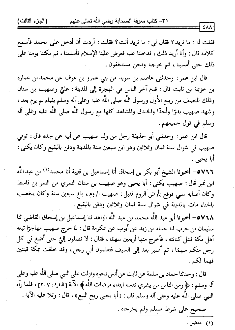 - قَالَ: وَحَدَّثَنَا حَمَّادُ بْنُ سَلَمَةَ ، عَنْ ثَابِتٍ ، عَنْ أَنَسٍ - نَحْوَهُ - ، وَنَزَلْتُ عَلَى النَّبِيِّ صَلَّى اللَّهُ عَلَيْهِ وَسَلَّمَ: { وَمَنِ النَّاسِ مَنْ يَشْرِي نَفْسَهُ ابْتِغَاءَ مَرْضَاةِ اللَّهِ } ، فَلَمَّا رَآهُ النَّبِيُّ صَلَّى اللَّهُ عَلَيْهِ وَسَلَّمَ قَالَ: " أَبَا يَحْيَى رَبِحَ الْبَيْعُ " قَالَ: وَتَلَا عَلَيْهِ الْآيَةَ " صَحِيحٌ عَلَى شَرْطِ مُسْلِمٍ ، وَلَمْ يُخَرِّجَاهُ "