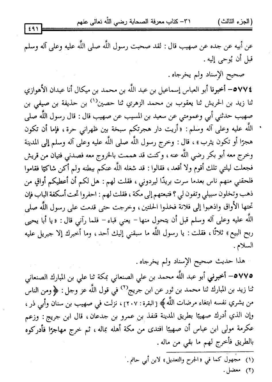 5775 - أَخْبَرَنِي أَبُو عَبْدِ اللَّهِ مُحَمَّدُ بْنِ عَلِيٍّ الصَّنْعَانِيُّ ، بِمَكَّةَ ، ثَنَا عَلِيُّ بْنُ الْمُبَارَكِ الصَّنْعَانِيُّ ، ثَنَا زَيْدُ بْنُ الْمُبَارَكِ ، ثَنَا مُحَمَّدُ بْنُ ثَوْرٍ ، عَنِ ابْنِ جُرَيْجٍ ، فِي قَوْلِ اللَّهِ عَزَّ وَجَلَّ: { وَمِنَ النَّاسِ مَنْ يَشْرِي نَفْسَهُ ابْتِغَاءَ مَرْضَاةِ اللَّهِ } " نَزَلَتْ فِي صُهَيْبِ بْنِ سِنَانٍ ، وَأَبِي ذَرٍّ ، وَإِنَّ الَّذِي أَدْرَكَ صُهَيْبًا بِطَرِيقِ الْمَدِينَةِ قُنْفُذُ بْنُ عَمْرِو بْنِ جُدْعَانَ " ، قَالَ ابْنُ جُرَيْجٍ: وَزَعَمَ عِكْرِمَةُ مَوْلَى ابْنِ عَبَّاسٍ ، " أَنَّ صُهَيْبًا افْتَدَى مِنْ مَكَّةَ أَهْلَهُ بِمَالِهِ ، ثُمَّ خَرَجَ مُهَاجِرًا ، فَأَدْرَكُوهُ بِالطَّرِيقِ ، فَأَخْرَجَ لَهُمْ مَا بَقِيَ مِنْ مَالِهِ