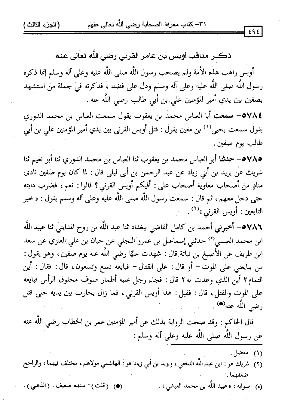 5784 - سَمِعْتُ أَبَا الْعَبَّاسِ مُحَمَّدَ بْنَ يَعْقُوبَ يَقُولُ: سَمِعْتُ الْعَبَّاسَ بْنَ مُحَمَّدٍ الدُّورِيَّ يَقُولُ: سَمِعْتُ يَحْيَى بْنَ مَعِينٍ يَقُولُ: " قُتِلَ أُوَيْسٌ الْقَرَنِيُّ بَيْنَ يَدَيْ أَمِيرِ الْمُؤْمِنِينَ عَلِيِّ بْنِ أَبِي طَالِبٍ يَوْمَ صِفِّينَ