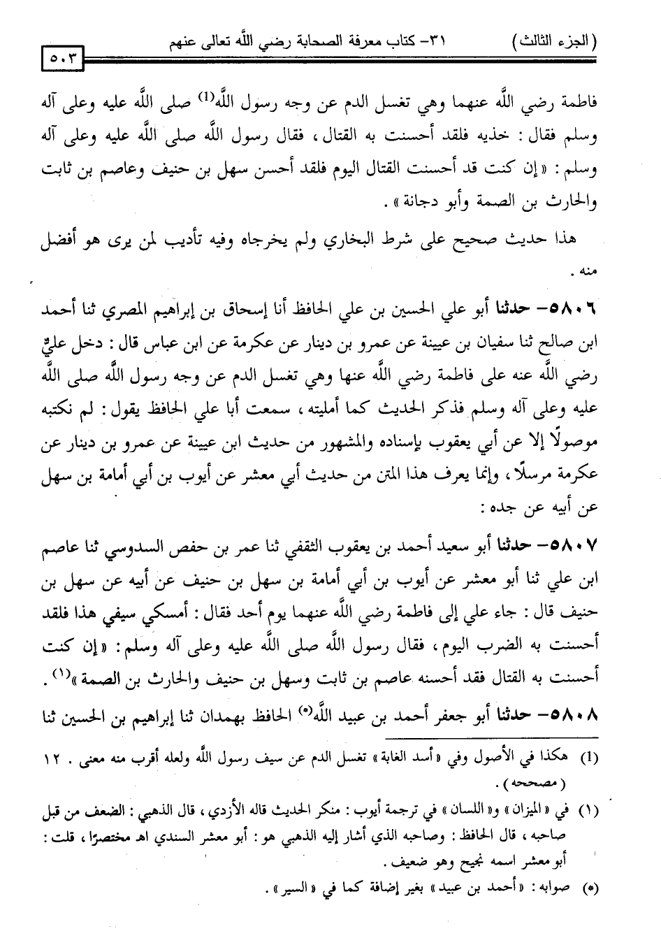 5807 - حَدَّثَنَا أَبُو سَعِيدٍ أَحْمَدُ بْنُ يَعْقُوبَ الثَّقَفِيُّ ، ثَنَا عُمَرُ بْنُ حَفْصٍ السَّدُوسِيُّ ، ثَنَا عَاصِمُ بْنُ عَلِيٍّ ، ثَنَا أَبُو مَعْشَرٍ ، عَنْ أَيُّوبَ بْنِ أَبِي أُمَامَةَ بْنِ سَهْلِ بْنِ حُنَيْفٍ ، عَنْ أَبِيهِ ، عَنْ سَهْلِ بْنِ حُنَيْفٍ قَالَ: جَاءَ عَلِيٌّ إِلَى فَاطِمَةَ رَضِيَ اللَّهُ عَنْهُمَا يَوْمَ أُحُدٍ ، فَقَالَ: أَمْسِكِي سَيْفِي هَذَا فَلَقَدْ أَحْسَنْتُ بِهِ الضَّرْبَ الْيَوْمَ ، فَقَالَ رَسُولُ اللَّهِ صَلَّى اللَّهُ عَلَيْهِ وَسَلَّمَ: " إِنْ كُنْتَ أَحْسَنْتَ بِهِ الْقِتَالَ فَقَدْ أَحْسَنَهُ عَاصِمُ بْنُ ثَابِتٍ وَسَهْلُ بْنُ حُنَيْفٍ وَالْحَارِثُ بْنُ الصِّمَّةِ "