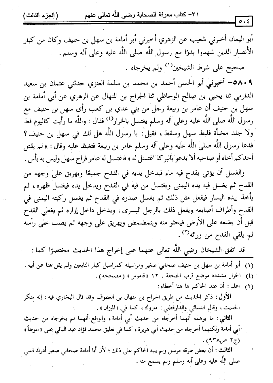 5809 - أَخْبَرَنِي أَبُو الْحَسَنِ أَحْمَدُ بْنُ مُحَمَّدِ بْنِ سَلَمَةَ الْعَنَزِيُّ ، حَدَّثَنِي عُثْمَانُ بْنُ سَعِيدٍ الدَّارِمِيُّ ، ثَنَا يَحْيَى بْنُ صَالِحٍ الْوُحَاظِيُّ ، ثَنَا الْجَرَّاحُ بْنُ الْمِنْهَالِ ، عَنِ الزُّهْرِيِّ ، عَنْ أَبِي أُمَامَةَ بْنِ سَهْلِ بْنِ حُنَيْفٍ ، أَنَّ عَامِرَ بْنَ رَبِيعَةَ رَجُلٌ مِنْ بَنِي عَدِيِّ بْنِ كَعْبٍ رَأَى سَهْلَ بْنَ حُنَيْفٍ مَعَ رَسُولِ اللَّهِ صَلَّى اللَّهُ عَلَيْهِ وَسَلَّمَ يَغْتَسِلُ بِالْخَرَّارِ ، فَقَالَ: وَاللَّهِ مَا رَأَيْتُ كَالْيَوْمِ قَطُّ ، وَلَا جَلْدَ مُخَبَّأَةٍ ، فَلُبِطَ سَهْلٌ وَسَقَطَ فَقِيلَ: يَا رَسُولَ اللَّهِ ، هَلْ لَكَ فِي سَهْلِ بْنِ حُنَيْفٍ ؟ فَدَعَا رَسُولُ اللَّهِ صَلَّى اللَّهُ عَلَيْهِ وَسَلَّمَ عَامِرَ بْنَ رَبِيعَةَ فَتَغَيَّظَ عَلَيْهِ ، وَقَالَ: " لِمَ يَقْتُلُ أَحَدُكُمْ أَخَاهُ أَوْ صَاحِبَهُ أَلَا يَدْعُو بِالْبَرَكَةِ ، اغْتَسِلْ لَهُ " فَاغْتَسَلَ لَهُ عَامِرٌ فَرَاحَ سَهْلٌ ، وَلَيْسَ بِهِ بَأْسٌ ، " وَالْغُسْلُ أَنْ يُؤْتَى بِقَدَحٍ فِيهِ مَاءٌ فَيُدْخِلُ يَدَيْهِ فِي الْقَدَحِ جَمِيعًا ، وَيُهَرِيقُ عَلَى وَجْهِهِ مِنَ الْقَدَحِ ، ثُمَّ يَغْسِلُ فِيهِ يَدَهُ الْيُمْنَى وَيَغْتَسِلُ مِنْ فِيهِ فِي الْقَدَحِ ، وَيُدْخِلُ يَدَهُ فَيَغْسِلُ ظَهْرَهُ ، ثُمَّ يَأْخُذُ بِيَدِهِ الْيَسَارِ فَيَفْعَلُ مِثْلَ ذَلِكَ ، ثُمَّ يَغْسِلُ صَدْرَهُ فِي الْقَدَحِ ، ثُمَّ يَغْسِلُ رُكْبَتَهُ الْيُمْنَى فِي الْقَدَحِ ، وَأَطْرَافَ أَصَابِعِهِ ، وَيَفْعَلُ ذَلِكَ بِالرِّجْلِ الْيُسْرَى ، وَيَدْخُلُ دَاخِلَ إِزَارِهِ ، ثُمَّ يُغَطِّي الْقَدَحَ قَبْلَ أَنْ يَضَعَهُ عَلَى الْأَرْضِ فَيَحْثُو مِنْهُ ، وَيَتَمَضْمَضُ وَيُهَرِيقُ عَلَى وَجْهِهِ ، ثُمَّ يَصُبُّ عَلَى رَأْسِهِ ، ثُمَّ يُلْقِي الْقَدَحَ مِنْ وَرَائِهِ " -[505]-