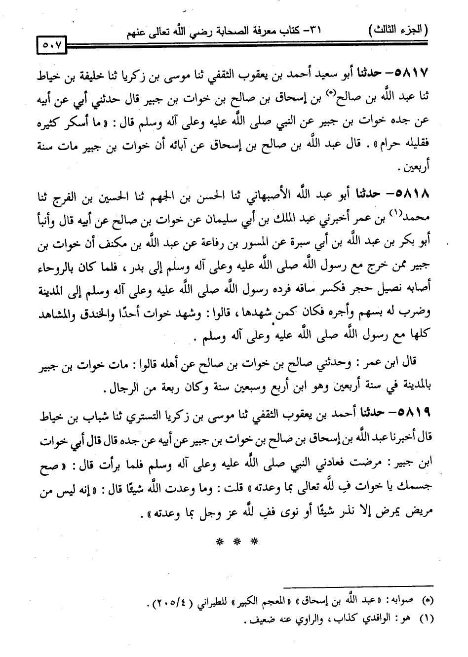 5818 - حَدَّثَنَا أَبُو عَبْدِ اللَّهِ الْأَصْبَهَانِيُّ ، ثَنَا الْحَسَنُ بْنُ الْجَهْمِ ، ثَنَا الْحُسَيْنُ بْنُ الْفَرَجِ ، ثَنَا مُحَمَّدُ بْنُ عُمَرَ ، أَخْبَرَنِي عَبْدُ الْمَلِكِ بْنُ أَبِي سُلَيْمَانَ ، عَنْ خَوَّاتِ بْنِ صَالِحٍ ، عَنْ أَبِيهِ ، قَالَ: وَأَنْبَأَ أَبُو بَكْرِ بْنُ عَبْدِ اللَّهِ بْنِ أَبِي سَبْرَةَ ، عَنِ الْمِسْوَرِ بْنِ رِفَاعَةَ ، عَنْ عَبْدِ اللَّهِ بْنِ مِكْنَفٍ ، أَنَّ خَوَّاتَ بْنَ جُبَيْرٍ ، مِمَّنْ خَرَجَ مَعَ رَسُولِ اللَّهِ صَلَّى اللَّهُ عَلَيْهِ وَسَلَّمَ إِلَى بَدْرٍ ، فَلَمَّا كَانَ بِالرَّوْحَاءِ أَصَابَهُ نَصِيلُ حَجَرٍ فَكَسَرَ سَاقَهُ ، " فَرَدَّهُ رَسُولُ اللَّهِ صَلَّى اللَّهُ عَلَيْهِ وَسَلَّمَ إِلَى الْمَدِينَةِ وَضَرَبَ لَهُ بِسَهْمٍ وَأَجْرِهِ ، فَكَانَ كَمَنْ شَهِدَهَا " ، قَالُوا: وَشَهِدَ خَوَّاتُ أُحُدًا ، وَالْخَنْدَقَ ، وَالْمَشَاهِدَ كُلَّهَا مَعَ رَسُولِ اللَّهِ صَلَّى اللَّهُ عَلَيْهِ وَسَلَّمَ