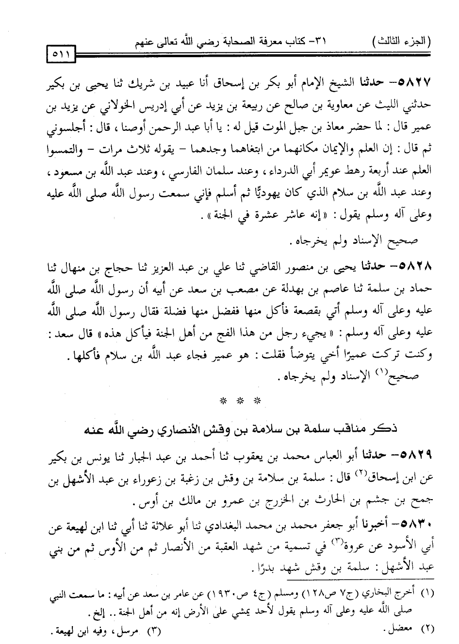 5827 - حَدَّثَنَا الشَّيْخُ الْإِمَامُ أَبُو بَكْرِ بْنُ إِسْحَاقَ ، أَنَا عُبَيْدُ بْنُ شَرِيكٍ ، ثَنَا يَحْيَى بْنُ بُكَيْرٍ ، حَدَّثَنِي اللَّيْثُ ، عَنْ مُعَاوِيَةَ بْنِ صَالِحٍ ، عَنْ رَبِيعَةَ بْنِ يَزِيدَ ، عَنْ أَبِي إِدْرِيسَ الْخَوْلَانِيِّ ، عَنْ يَزِيدَ بْنِ عَمِيرَةَ قَالَ: لَمَّا حَضَرَ مُعَاذَ بْنَ جَبَلٍ الْمَوْتُ قِيلَ لَهُ: يَا أَبَا عَبْدِ الرَّحْمَنِ أَوْصِنَا ، قَالَ: أَجْلِسُونِي ، ثُمَّ قَالَ: إِنَّ الْعِلْمَ وَالْإِيمَانَ مَكَانَهُمَا ، مَنِ ابْتَغَاهُمَا وَجَدَهُمَا يَقُولُهُ ثَلَاثَ مَرَّاتٍ ، وَالْتَمِسُوا الْعِلْمَ عِنْدَ أَرْبَعَةِ رَهْطٍ: عُوَيْمِرٍ أَبِي الدَّرْدَاءِ ، وَعِنْدَ سَلْمَانَ الْفَارِسِيِّ ، وَعِنْدَ عَبْدِ اللَّهِ بْنِ مَسْعُودٍ ، وَعِنْدَ عَبْدِ اللَّهِ بْنِ سَلَّامٍ الَّذِي كَانَ يَهُودِيًّا ، ثُمَّ أَسْلَمَ ، فَإِنِّي سَمِعْتُ رَسُولَ اللَّهِ صَلَّى اللَّهُ عَلَيْهِ وَسَلَّمَ ، يَقُولُ: " إِنَّهُ عَاشِرُ عَشْرَةٍ فِي الْجَنَّةِ "
