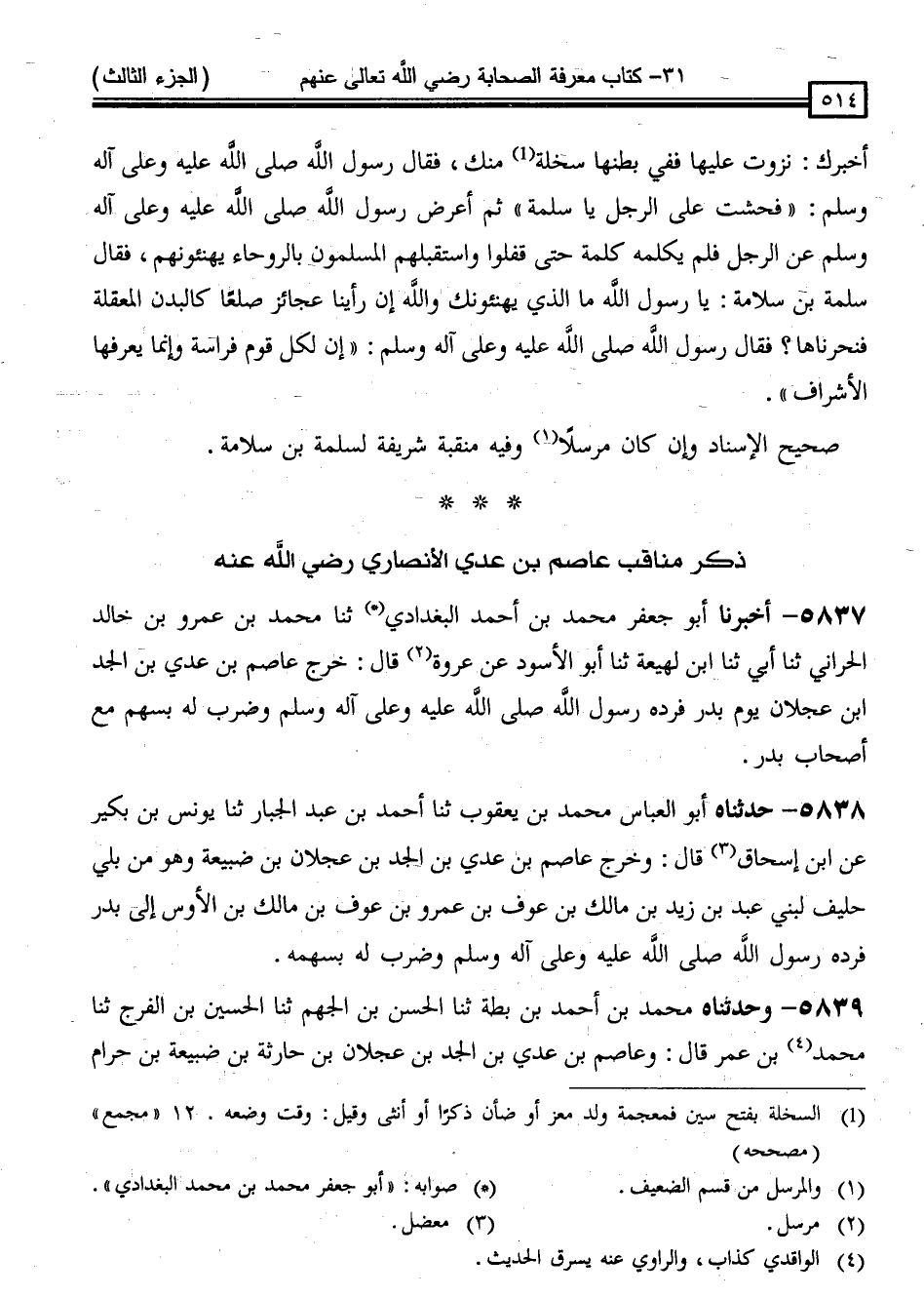 5839 - وَحَدَّثَنَاهُ مُحَمَّدُ بْنُ أَحْمَدَ بْنِ بُطَّةَ ، ثَنَا الْحَسَنُ بْنُ الْجَهْمِ ، ثَنَا الْحُسَيْنُ بْنُ الْفَرَجِ ، ثَنَا مُحَمَّدُ بْنُ عُمَرَ ، قَالَ: " وَعَاصِمُ بْنُ عَدِيِّ بْنِ الْجَدِّ بْنِ عَجْلَانَ بْنِ حَارِثَةَ بْنِ ضُبَيْعَةَ بْنِ حَرَامِ -[515]- بْنِ جُعَلِ بْنِ عَمْرِو بْنِ خُثَيْمِ بْنِ وَدْمِ بْنِ ذِبْيَانَ بْنِ هُمَيمِ بْنِ هَتَمِ بْنِ بَلِيِّ بْنِ عَمْرِو بْنِ الْحَافِ بْنِ قُضَاعَةَ ، وَكَانَ يُكَنَّى أَبَا عَمْرِو وَيُقَالَ أَبُو عَبْدِ اللَّهِ "
