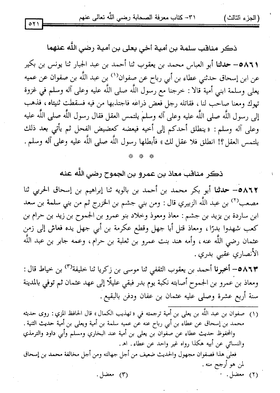 5863 - أَخْبَرَنَا أَحْمَدُ بْنُ يَعْقُوبَ الثَّقَفِيُّ ، ثَنَا مُوسَى بْنُ زَكَرِيَّا ، ثَنَا خَلِيفَةُ بْنُ خَيَّاطٍ ، قَالَ: " وَمُعَاذُ بْنُ عَمْرِو بْنِ الْجَمُوحِ أَصَابَتْهُ نَكْبَةٌ يَوْمَ بَدْرٍ فَبَقِيَ عَلِيلًا إِلَى عَهْدِ عُثْمَانَ ، ثُمَّ تُوُفِّيَ بِالْمَدِينَةِ سَنَةَ أَرْبَعَ عَشْرَةَ ، وَصَلَّى عَلَيْهِ عُثْمَانُ بْنُ عَفَّانَ وَدُفِنَ بِالْبَقِيعِ "