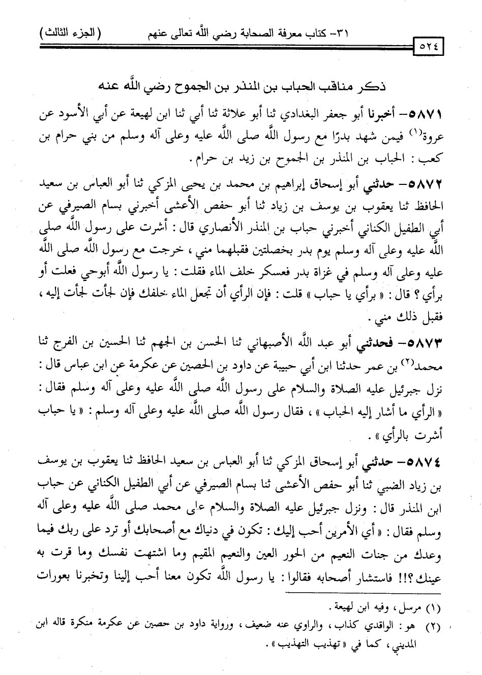 5872 - حَدَّثَنِي أَبُو إِسْحَاقَ إِبْرَاهِيمُ بْنُ مُحَمَّدِ بْنِ يَحْيَى الْمُزَكِّي ، ثَنَا أَبُو الْعَبَّاسِ بْنُ سَعِيدٍ الْحَافِظُ ، ثَنَا يَعْقُوبُ بْنُ يُوسُفَ بْنِ زِيَادٍ ، ثَنَا أَبُو حَفْصٍ الْأَعْشَى ، أَخْبَرَنِي بَسَّامٍ الصَّيْرَفِيُّ ، عَنْ أَبِي الطُّفَيْلِ الْكِنَانِيُّ ، أَخْبَرَنِي حُبَابُ بْنُ الْمُنْذِرِ الْأَنْصَارِيُّ ، قَالَ: " أَشَرْتُ عَلَى رَسُولِ اللَّهِ صَلَّى اللَّهُ عَلَيْهِ وَسَلَّمَ يَوْمَ بَدْرٍ بِخَصْلَتَيْنِ ، فَقَبِلَهُمَا مِنِّي خَرَجْتُ مَعَ رَسُولِ اللَّهِ صَلَّى اللَّهُ عَلَيْهِ وَسَلَّمَ فِي غَزَاةِ بَدْرٍ فَعَسْكَرَ خَلْفَ الْمَاءِ فَقُلْتُ: يَا رَسُولَ اللَّهِ ، أَبِوَحْيٍ فَعَلْتَ أَوْ بِرَأْيٍ ؟ قَالَ: بِرَأْيٍ يَا حُبَابُ قُلْتُ: فَإِنَّ الرَّأْيَ أَنْ تَجْعَلَ الْمَاءَ خَلْفَكَ ، فَإِنْ لَجَأْتَ لَجَأْتَ إِلَيْهِ ، فَقَبِلَ ذَلِكَ مِنِّي "