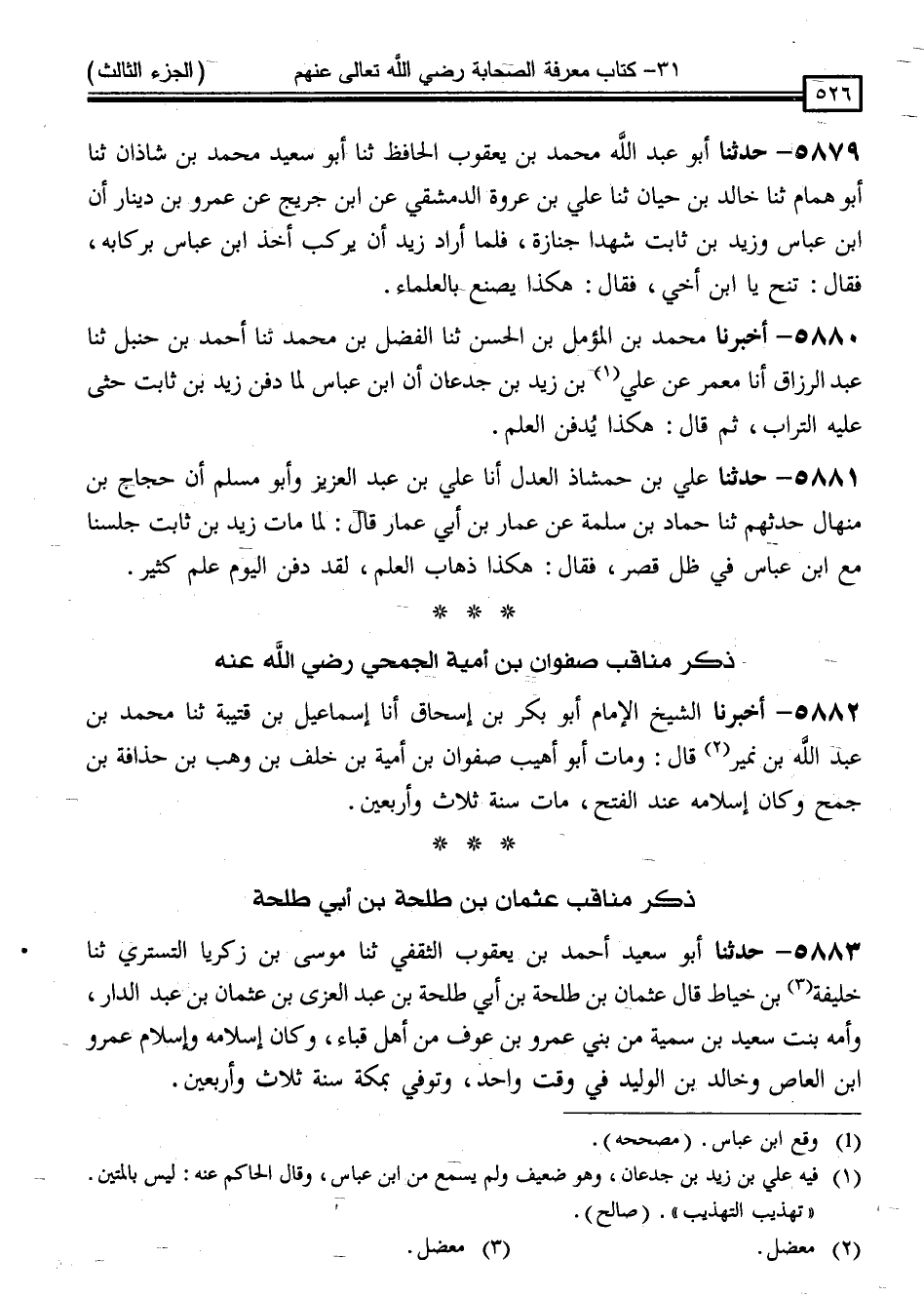 5881 - حَدَّثَنَا عَلِيُّ بْنُ حَمْشَاذَ الْعَدْلُ ، أَنَا عَلِيُّ بْنُ عَبْدِ الْعَزِيزِ ، وَأَبُو مُسْلِمٍ ، أَنَّ حَجَّاجَ بْنَ مِنْهَالٍ حَدَّثَهُمْ ، ثَنَا حَمَّادُ بْنُ سَلَمَةَ ، عَنْ عَمَّارِ بْنِ أَبِي عَمَّارٍ ، قَالَ: لَمَّا مَاتَ زَيْدُ بْنُ ثَابِتٍ جَلَسْنَا مَعَ ابْنِ عَبَّاسٍ فِي ظِلِّ قَصْرٍ فَقَالَ: " هَكَذَا ذَهَابُ الْعِلْمِ لَقَدْ دُفِنَ الْيَوْمَ عَلْمٌ كَثِيرٌ "