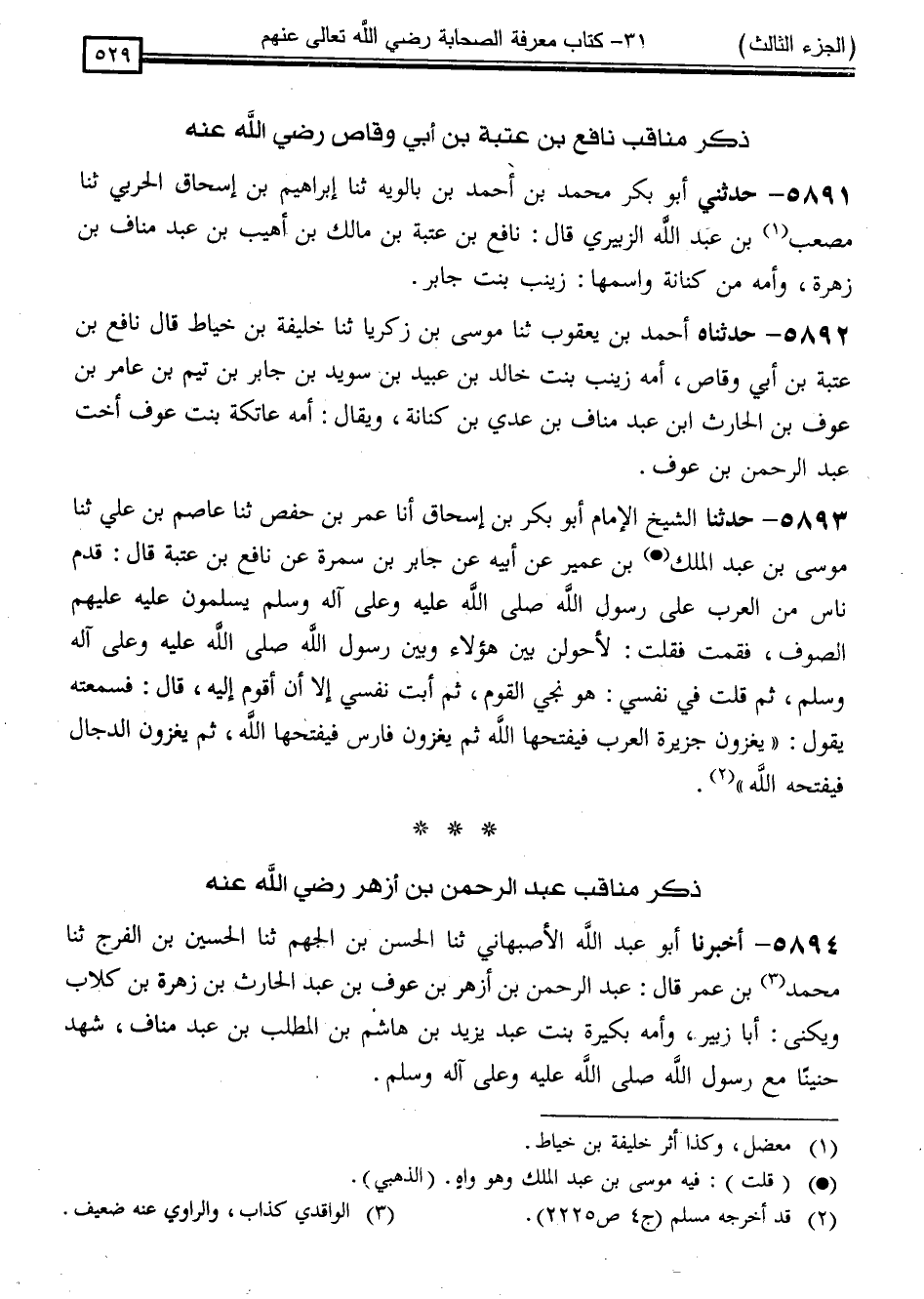 5891 - حَدَّثَنِي أَبُو بَكْرٍ مُحَمَّدُ بْنُ أَحْمَدَ بْنِ بَالَوَيْهِ ، ثَنَا إِبْرَاهِيمُ بْنُ إِسْحَاقَ الْحَرْبِيُّ ، ثَنَا مُصْعَبُ بْنُ عَبْدِ اللَّهِ الزُّبَيْرِيُّ ، قَالَ: " نَافِعُ بْنُ عُتْبَةَ بْنِ مَالِكِ بْنِ أَهْيَبَ بْنِ عَبْدِ مَنَافِ بْنِ زُهْرَةَ ، وَأُمُّهُ مِنْ كِنَانَةَ ، وَاسْمُهَا زَيْنَبُ بِنْتُ جَابِرٍ "