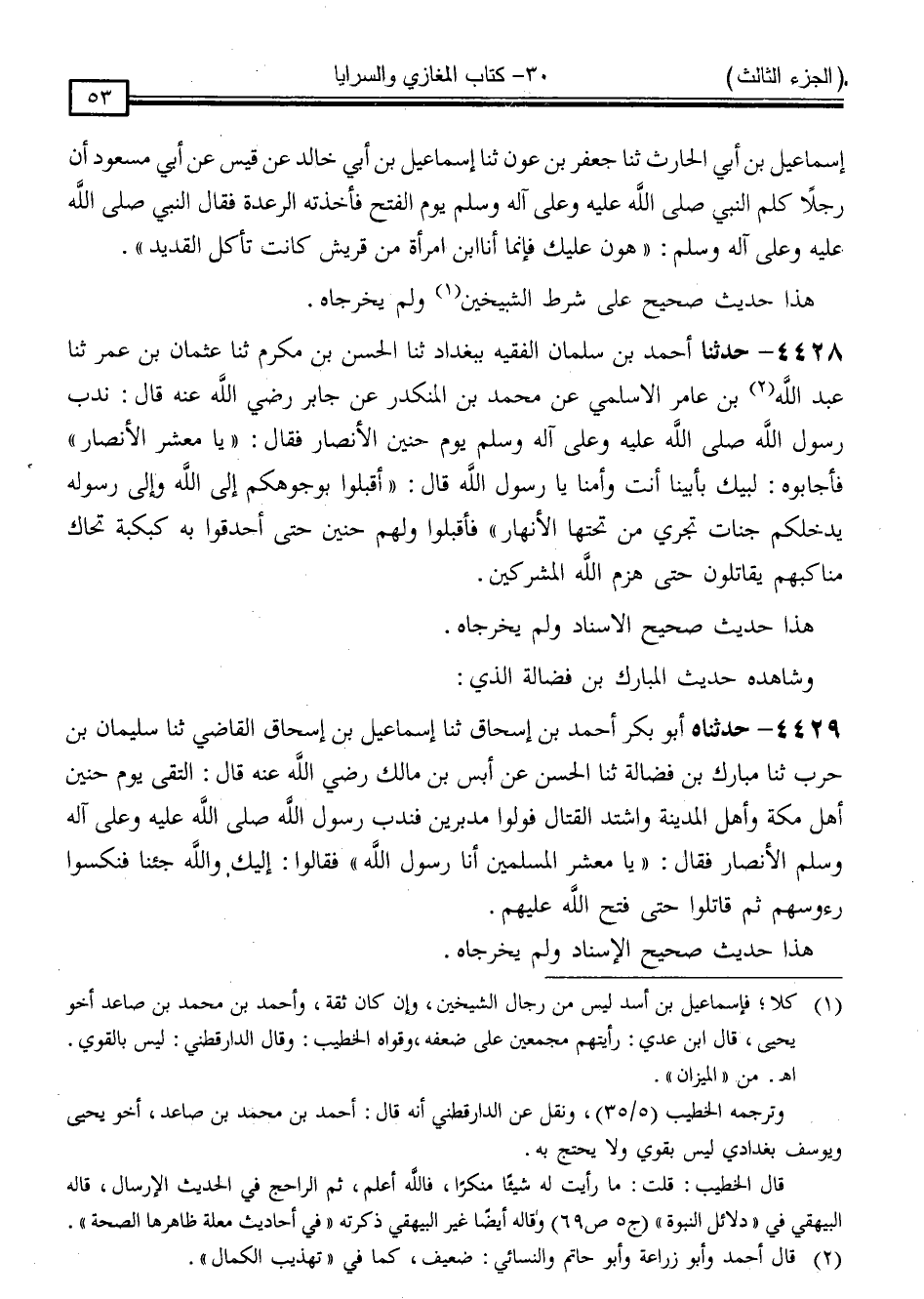 4428 - حَدَّثَنَا أَحْمَدُ بْنُ سَلْمَانَ الْفَقِيهُ ، بِبَغْدَادَ ، ثنا الْحَسَنُ بْنُ مُكْرَمٍ ، ثنا عُثْمَانُ بْنُ عُمَرَ ، ثنا عَبْدُ اللَّهِ بْنُ عَامِرٍ الْأَسْلَمِيُّ ، عَنْ مُحَمَّدِ بْنِ الْمُنْكَدِرِ ، عَنْ جَابِرٍ رَضِيَ اللَّهُ عَنْهُ قَالَ: نَدَبَ رَسُولُ اللَّهِ صَلَّى اللَّهُ عَلَيْهِ وَسَلَّمَ يَوْمَ حُنَيْنٍ الْأَنْصَارَ ، فَقَالَ: " يَا مَعْشَرَ الْأَنْصَارِ " ، فَأَجَابُوهُ: لَبَّيْكَ بِأَبِينَا أَنْتَ وَأُمِّنَا يَا رَسُولَ اللَّهِ ، قَالَ: " أَقْبِلُوا بِوُجُوهِكُمْ إِلَى اللَّهِ وَإِلَى رَسُولِهِ يُدْخِلْكُمْ جَنَّاتٍ تَجْرِي مِنْ تَحْتِهَا الْأَنْهَارُ " فَأَقْبَلُوا وَلَهُمْ حُنَيْنٌ حَتَّى أَحْدَقُوا بِهِ كَبْكَبَةً تُحَاكُ مَنَاكِبُهُمْ يُقَاتِلُونَ حَتَّى هَزَمَ اللَّهُ الْمُشْرِكِينَ