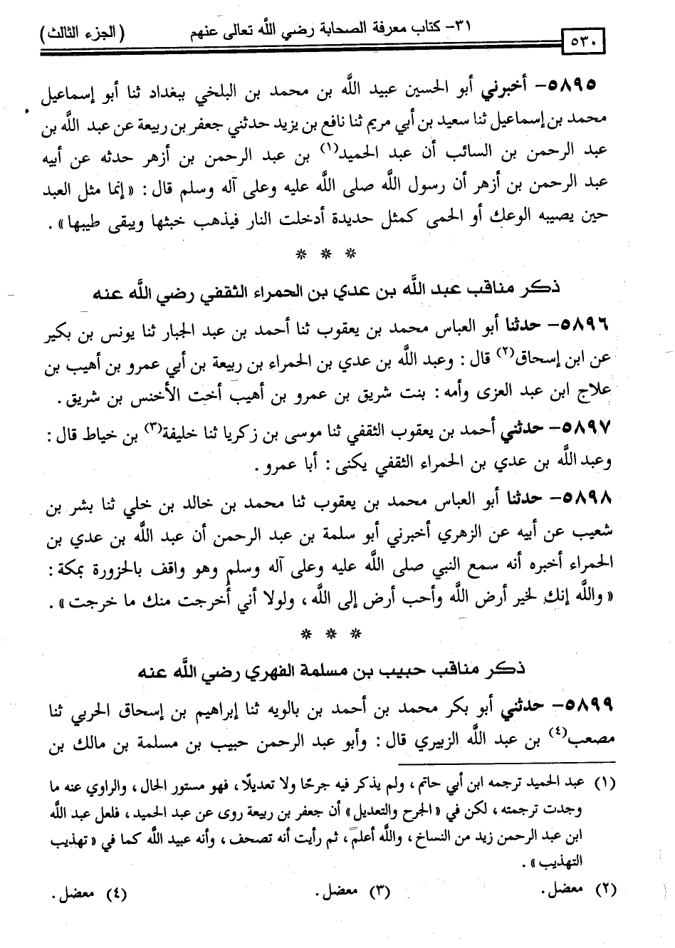 5899 - حَدَّثَنِي أَبُو بَكْرٍ مُحَمَّدُ بْنُ أَحْمَدَ بْنِ بَالَوَيْهِ ، ثَنَا إِبْرَاهِيمُ بْنُ إِسْحَاقَ الْحَرْبِيُّ ، ثَنَا مُصْعَبُ بْنُ عَبْدِ اللَّهِ الزُّبَيْرِيُّ ، قَالَ: " وَأَبُو عَبْدِ الرَّحْمَنِ حَبِيبُ بْنُ مَسْلَمَةَ بْنِ مَالِكِ بْنِ -[531]- وَهْبِ بْنِ ثَعْلَبَةَ بْنِ وَاثِلَةَ بْنِ عَمْرِو بْنِ سِنَانٍ الْفِهْرِيُّ "