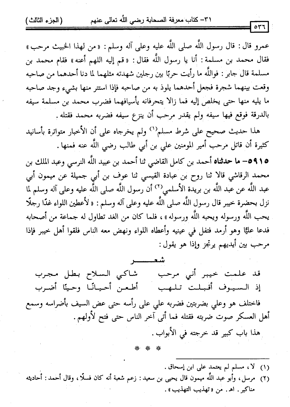 قَدْ عَلِمَتْ خَيْبَرُ أَنِّي مَرْحَبٌ ... شَاكِي السِّلَاحِ بَطَلٌ مُجَرَّبُ