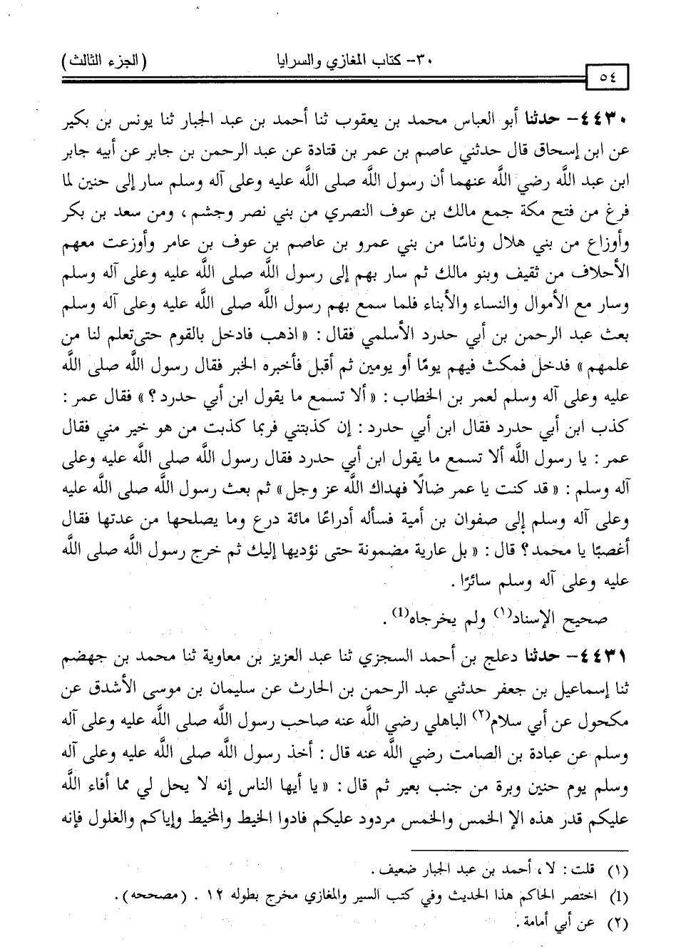 4430 - حَدَّثَنَا أَبُو الْعَبَّاسِ مُحَمَّدُ بْنُ يَعْقُوبَ ، ثنا أَحْمَدُ بْنُ عَبْدِ الْجَبَّارِ ، ثنا يُونُسُ بْنُ بُكَيْرٍ ، عَنِ ابْنِ إِسْحَاقَ ، قَالَ: حَدَّثَنِي عَاصِمُ بْنُ عُمَرَ بْنِ قَتَادَةَ ، عَنْ عَبْدِ الرَّحْمَنِ بْنِ جَابِرٍ ، عَنْ أَبِيهِ جَابِرِ بْنِ عَبْدِ اللَّهِ رَضِيَ اللَّهُ عَنْهُمَا ، أَنَّ رَسُولَ اللَّهِ صَلَّى اللَّهُ عَلَيْهِ وَسَلَّمَ سَارَ إِلَى حُنَيْنٍ لَمَّا فَرَغَ مِنْ فَتْحِ مَكَّةَ جَمَعَ مَالِكَ بْنَ عَوْفٍ النَّصْرِيَّ مِنْ بَنِي نَصْرٍ ، وَجُشَمَ وَمِنْ سَعْدِ بْنِ بَكْرٍ وأَوْزَاعَ مِنْ بَنِي هِلَالٍ ، وَنَاسًا مِنْ بَنِي عَمْرِو بْنِ عَاصِمِ بْنِ عَوْفِ بْنِ عَامِرٍ ، وَأَوْزَعَتْ مَعَهُمُ الْأَحْلَافُ مِنْ ثَقِيفٍ ، وَبَنُو مَالِكٍ ، ثُمَّ سَارَ بِهِمْ إِلَى رَسُولِ اللَّهِ صَلَّى اللَّهُ عَلَيْهِ وَسَلَّمَ ، وَسَارَ مَعَ الْأَمْوَالِ وَالنِّسَاءِوَالْأَبْنَاءِ ، فَلَمَّا سَمِعَ بِهِمْ رَسُولُ اللَّهِ صَلَّى اللَّهُ عَلَيْهِ وَسَلَّمَ بَعَثَ عَبْدَ الرَّحْمَنِ بْنَ أَبِي حَدْرَدٍ الْأَسْلَمِيَّ ، فَقَالَ: " اذْهَبْ فَادْخُلْ بِالْقَوْمِ حَتَّى تَعْلَمَ لَنَا مِنْ عِلْمِهِمْ " فَدَخَلَ فَمَكَثَ فِيهِمْ يَوْمًا أَوْ يَوْمَيْنِ ، ثُمَّ أَقْبَلَ فَأَخْبَرَهُ الْخَبَرَ ، فَقَالَ رَسُولُ اللَّهِ صَلَّى اللَّهُ عَلَيْهِ وَسَلَّمَ لِعُمَرَ بْنِ الْخَطَّابِ: أَلَا تَسْمَعُ مَا يَقُولُ ابْنُ أَبِي حَدْرَدٍ ؟ فَقَالَ عُمَرُ: كَذَبَ ابْنُ أَبِي حَدْرَدٍ ، فَقَالَ ابْنُ أَبِي حَدْرَدٍ: إِنْ كَذَّبْتَنِي فَرُبَّمَا كَذَّبْتَ مَنْ هُوَ خَيْرٌ مِنِّي ، فَقَالَ عُمَرُ: يَا رَسُولَ اللَّهِ ، أَلَا تَسْمَعُ مَا يَقُولُ ابْنُ أَبِي حَدْرَدٍ ؟ فَقَالَ رَسُولُ اللَّهِ صَلَّى اللَّهُ عَلَيْهِ وَسَلَّمَ: " قَدْ كُنْتَ يَا عُمَرُ ضَالًّا فَهَدَاكَ اللَّهُ عَزَّ وَجَلَّ " ، ثُمَّ بَعَثَ رَسُولُ اللَّهِ صَلَّى اللَّهُ عَلَيْهِ وَسَلَّمَ إِلَى صَفْوَانَ بْنِ أُمَيَّةَ فَسَأَلَهُ أَدْرَاعًا مِائَةَ دِرْعٍ ، وَمَا يُصْلِحُهَا مِنْ عِدَّتِهَا ، فَقَالَ: أَغَصْبًا يَا مُحَمَّدُ ؟ قَالَ: " بَلْ عَارِيَةٌ مَضْمُونَةٌ حَتَّى نُؤَدِّيَهَا إِلَيْكَ " ثُمَّ خَرَجَ رَسُولُ اللَّهِ صَلَّى اللَّهُ عَلَيْهِ وَسَلَّمَ سَائِرًا " صَحِيحُ الْإِسْنَادِ ، وَلَمْ يُخَرِّجَاهُ "