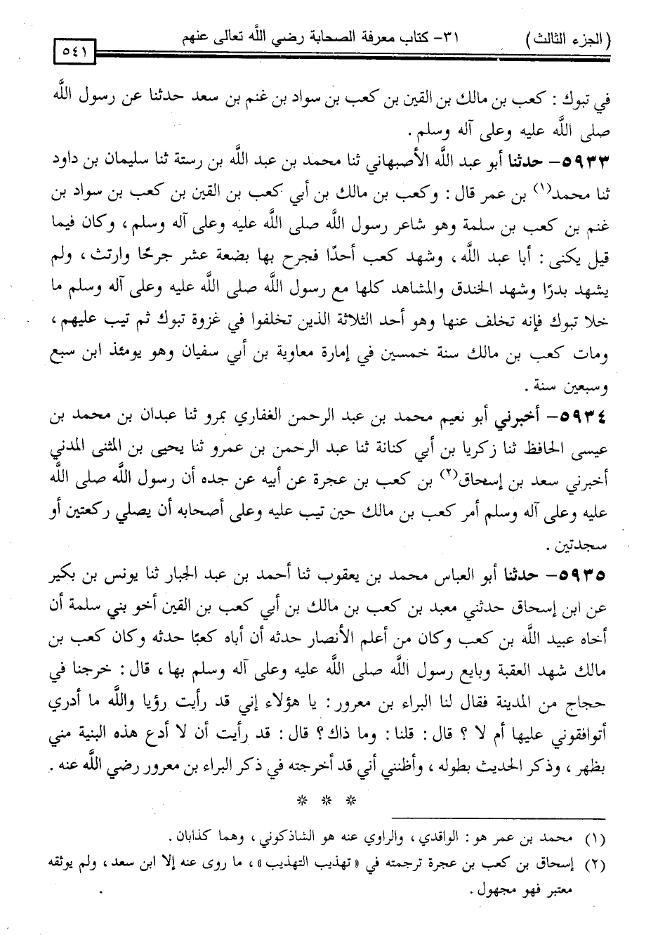 5933 - حَدَّثَنَا أَبُو عَبْدِ اللَّهِ الْأَصْبَهَانِيُّ ، ثَنَا مُحَمَّدُ بْنُ عَبْدِ اللَّهِ بْنِ رُسْتَةَ ، ثَنَا سُلَيْمَانُ بْنُ دَاوُدَ ، ثَنَا مُحَمَّدُ بْنُ عُمَرَ ، قَالَ: " وَكَعْبُ بْنُ مَالِكِ بْنِ أَبِي كَعْبِ بْنِ الْقَيْنِ بْنِ كَعْبِ بْنِ سَوَّادِ بْنِ غَنْمِ بْنِ كَعْبِ بْنِ سَلَمَةَ ، وَهُوَ شَاعِرُ رَسُولِ اللَّهِ صَلَّى اللَّهُ عَلَيْهِ وَسَلَّمَ وَكَانَ فِيمَا قِيلَ: يُكَنَّى أَبَا عَبْدِ اللَّهِ ، وَشَهِدَ كَعْبٌ أُحُدًا ، فَجُرِحَ بِهَا بَضْعَةَ عَشَرَ جُرْحًا وَارْتُثَّ ، وَلَمْ يَشْهَدْ بَدْرًا ، وَشَهِدَ الْخَنْدَقَ وَالْمَشَاهِدَ كُلَّهَا مَعَ رَسُولِ اللَّهِ صَلَّى اللَّهُ عَلَيْهِ وَسَلَّمَ مَا خَلَا تَبُوكَ ، فَإِنَّهُ تَخَلَّفَ عَنْهَا وَهُوَ أَحَدُ الثَّلَاثَةِ الَّذِينَ تَخَلَّفُوا فِي غَزْوَةِ تَبُوكَ ، ثُمَّ تِيبَ عَلَيْهِمْ ، وَمَاتَ كَعْبُ بْنُ مَالِكٍ سَنَةَ خَمْسِينَ فِي إِمَارَةِ مُعَاوِيَةَ بْنِ أَبِي سُفْيَانَ ، وَهُوَ يَوْمَئِذٍ ابْنُ سَبْعٍ وَسَبْعِينَ سَنَةً "