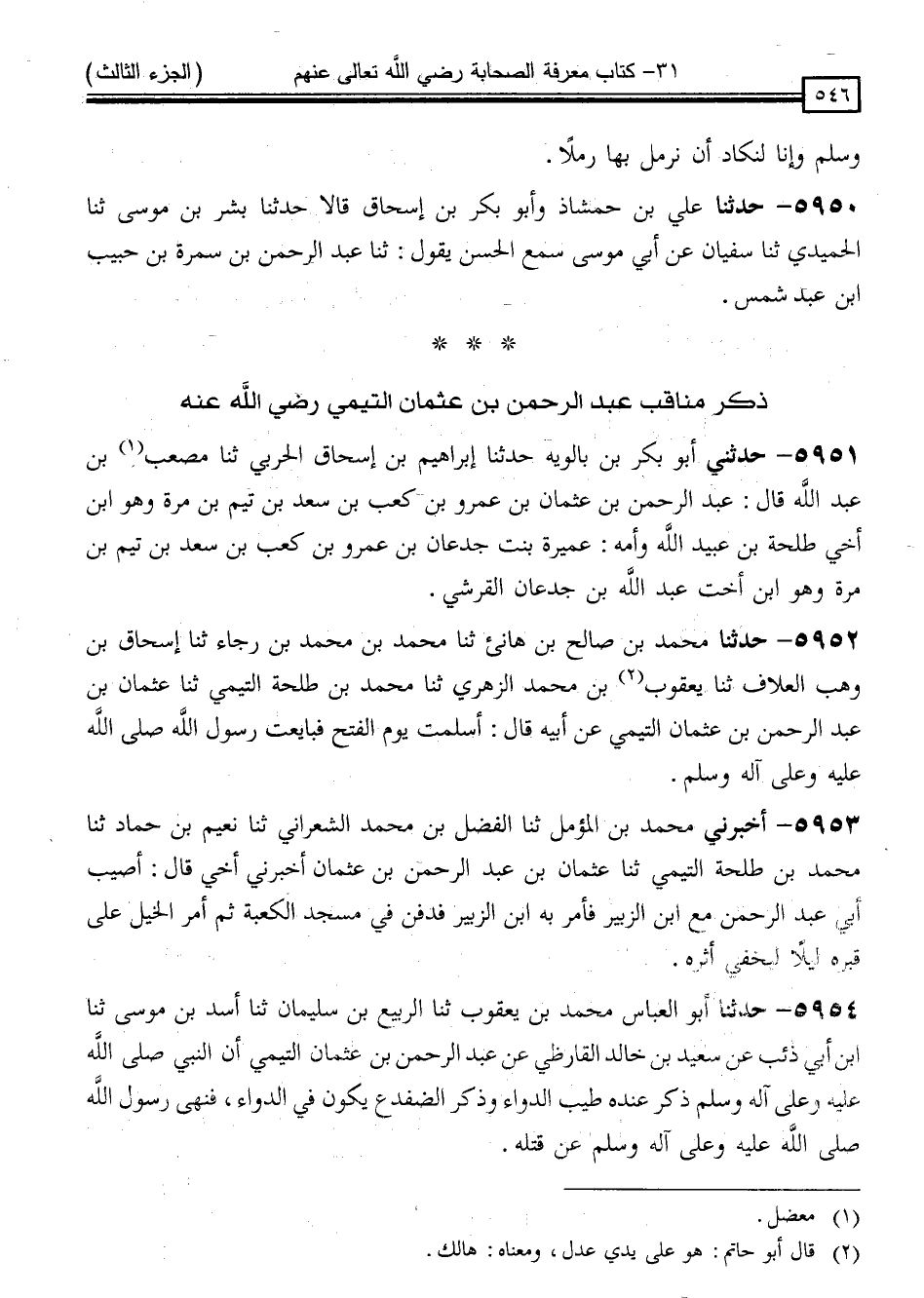 5953 - أَخْبَرَنِي مُحَمَّدُ بْنُ الْمُؤَمَّلِ ، ثَنَا الْفَضْلُ بْنُ مُحَمَّدٍ الشَّعْرَانِيُّ ، ثَنَا نُعَيْمُ بْنُ حَمَّادٍ ، ثَنَا مُحَمَّدُ بْنُ طَلْحَةَ التَّيْمِيُّ ، ثَنَا عُثْمَانُ بْنُ عَبْدِ الرَّحْمَنِ بْنِ عُثْمَانَ ، أَخْبَرَنِي أَخِي ، قَالَ: أُصِيبَ أَبِي عَبْدُ الرَّحْمَنِ مَعَ ابْنِ الزُّبَيْرِ ، " فَأَمَرَ بِهِ ابْنُ الزُّبَيْرِ فَدُفِنَ فِي مَسْجِدِ الْكَعْبَةِ ، ثُمَّ أَمَرَ الْخَيْلَ عَلَى قَبْرِهِ لَيْلًا لِيُخْفِيَ أَثَرَهُ "