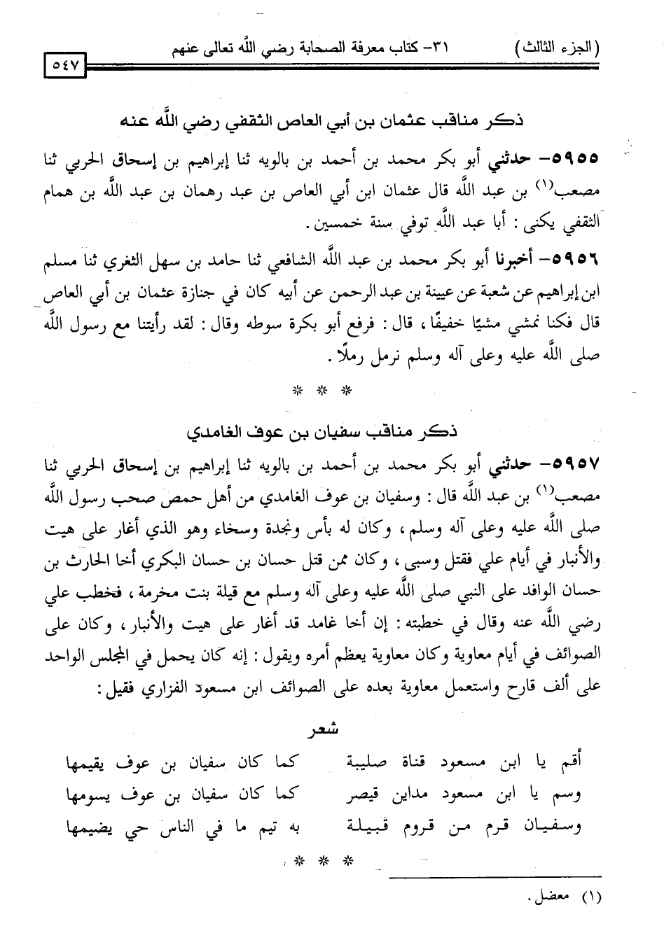 5957 - حَدَّثَنِي أَبُو بَكْرٍ مُحَمَّدُ بْنُ أَحْمَدَ بْنِ بَالَوَيْهِ ، ثَنَا إِبْرَاهِيمُ بْنُ إِسْحَاقَ الْحَرْبِيُّ ، ثَنَا مُصْعَبُ بْنُ عَبْدِ اللَّهِ ، قَالَ: " وَسُفْيَانُ بْنُ عَوْفٍ الْغَامِدِيُّ مِنْ أَهْلِ حِمْصٍ صَحِبَ رَسُولَ اللَّهِ صَلَّى اللَّهُ عَلَيْهِ وَسَلَّمَ ، وَكَانَ لَهُ بَأْسٌ وَنَجْدَة ٌ، وَسَخَاءٌ ، وَهُوَ الَّذِي أَغَارَ عَلَى هَيْتَ ، وَالْأَنْبَارِ فِي أَيَّامِ عَلِيٍّ فَقَتَلَ ، وَسَبَى وَكَانَ مِمَّنْ قَتَلَ حَسَّانَ بْنَ حَسَّانَ الْبَكْرِيَّ أَخَا الْحَارِثِ بْنِ حَسَّانَ الْوَافِدَ عَلَى النَّبِيِّ صَلَّى اللَّهُ عَلَيْهِ وَسَلَّمَ مَعَ قَيْلَةَ بِنْتِ مَخْرَمَةَ ، فَخَطَبَ عَلِيٌّ رَضِيَ اللَّهُ عَنْهُ ، وَقَالَ فِي خُطْبَتِهِ: إِنَّ أَخَا غَامِدٍ قَدْ أَغَارَ عَلَى هَيْتَ ، وَالْأَنْبَارِ ، وَكَانَ عَلَى الصَّوَائِفِ فِي أَيَّامِ مُعَاوِيَةَ ، وَكَانَ مُعَاوِيَةُ يُعَظِّمُ أَمْرَهُ ، وَيَقُولُ إِنَّهُ كَانَ يَحْمِلُ فِي الْمَجْلِسِ الْوَاحِدِ عَلَى أَلْفٍ قَارِحٍ ، وَاسْتَعْمَلَ مُعَاوِيَةُ بَعْدَهُ عَلَى الصَّوَائِفِ ابْنَ مَسْعُودٍ الْفَزَارِيَّ فَقِيلَ: