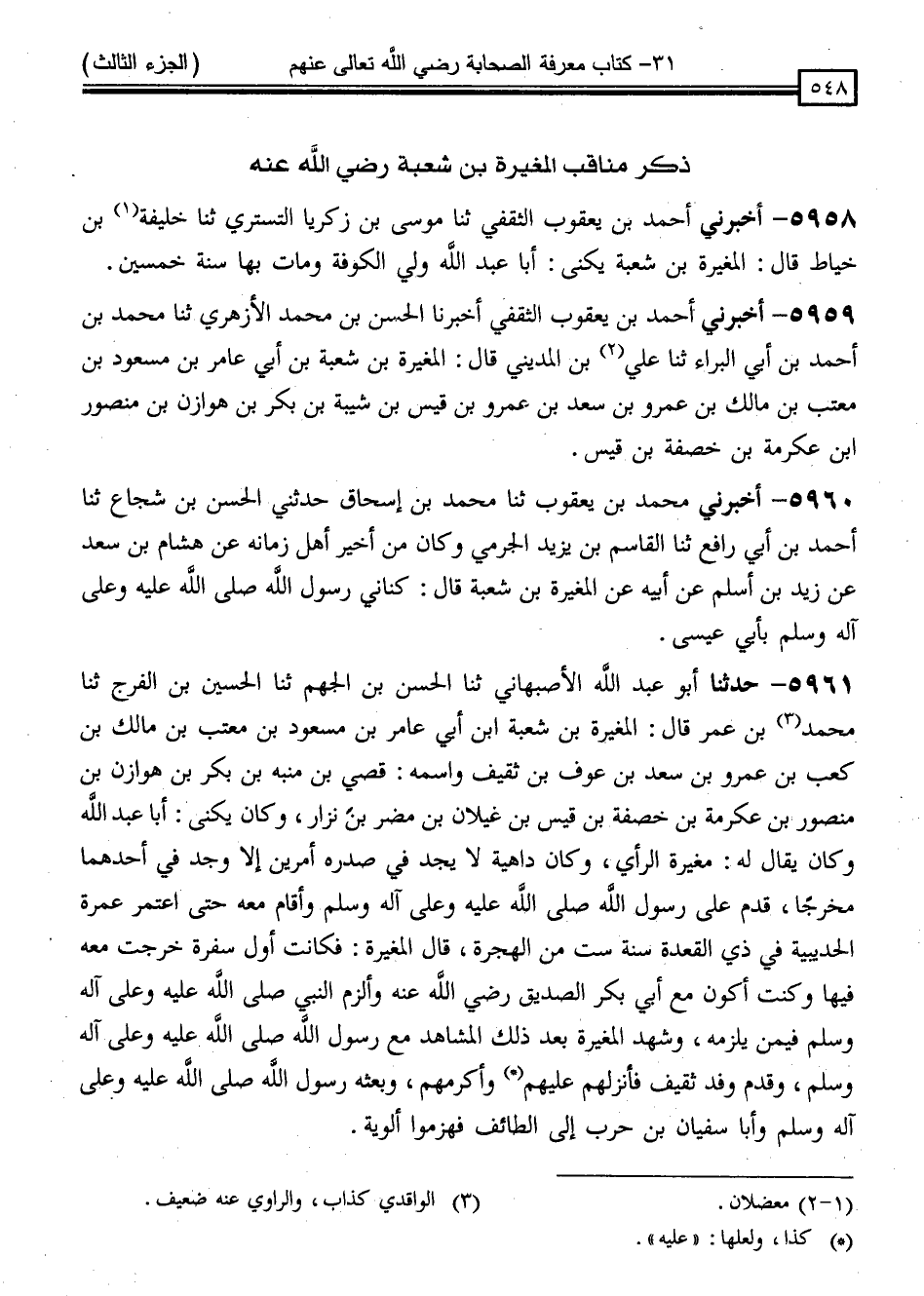 5961 - حَدَّثَنَا أَبُو عَبْدِ اللَّهِ الْأَصْبَهَانِيُّ ، ثَنَا الْحَسَنُ بْنُ الْجَهْمِ ، ثَنَا الْحُسَيْنُ بْنُ الْفَرَجِ ، ثَنَا مُحَمَّدُ بْنُ عُمَرَ ، قَالَ: " الْمُغِيرَةُ بْنُ شُعْبَةَ بْنِ أَبِي عَامِرِ بْنِ مَسْعُودِ بْنِ مُعَتِّبِ بْنِ مَالِكِ بْنِ كَعْبِ بْنِ عَمْرِو بْنِ سَعْدِ بْنِ عَوْفِ بْنِ ثَقِيفٍ وَاسْمُهُ قُصَيُّ بْنِ مُنَبِّهِ بْنِ بَكْرِ بْنِ هَوَازِنِ بْنِ مَنْصُورِ بْنِ عِكْرِمَةَ بْنِ خَصَفَةَ بْنِ قَيْسِ بْنِ غَيْلَانَ بْنِ مُضَرَ بْنِ نِزَارٍ ، وَكَانَ يُكَنَّى أَبَا عَبْدِ اللَّهِ ، وَكَانَ يُقَالُ لَهُ مُغِيرَةُ الرَّأْيِ ، وَكَانَ دَاهِيَةً لَا يَجِدُ فِي صَدْرِهِ أَمْرَيْنِ إِلَّا وَجَدَ فِي أَحَدِهِمَا مَخْرَجًا ، قَدِمَ عَلَى رَسُولِ اللَّهِ صَلَّى اللَّهُ عَلَيْهِ وَسَلَّمَ ، وَأَقَامَ مَعَهُ حَتَّى اعْتَمَرَ عُمَرَةَ الْحُدَيْبِيَةِ فِي ذِي الْقَعْدَةِ سَنَةَ سِتٍّ مِنَ الْهِجْرَةِ ، قَالَ الْمُغِيرَةُ: فَكَانَتْ أَوَّلُ سَفْرَةٍ خَرَجْتُ مَعَهُ فِيهَا ، وَكُنْتُ أَكُونُ مَعَ أَبِي بَكْرٍ الصِّدِّيقِ رَضِيَ اللَّهُ عَنْهُ ، وَأَلْزَمُ النَّبِيَّ صَلَّى اللَّهُ عَلَيْهِ وَسَلَّمَ ، فِيمَنْ يَلْزَمُهُ ، وَشَهِدَ الْمُغِيرَةُ بَعْدَ ذَلِكَ الْمَشَاهِدَ مَعَ رَسُولِ اللَّهِ صَلَّى اللَّهُ عَلَيْهِ وَسَلَّمَ ، وَقَدِمَ وَفْدُ ثَقِيفٍ فَأَنْزَلَهُمْ عَلَيْهِمْ وَأَكْرَمَهُمْ ، وَبَعَثَهُ رَسُولُ اللَّهِ صَلَّى اللَّهُ عَلَيْهِ وَسَلَّمَ وَأَبَا سُفْيَانَ بْنَ حَرْبٍ إِلَى الطَّائِفِ فَهَزَمُوا أَلْوِيَةً "