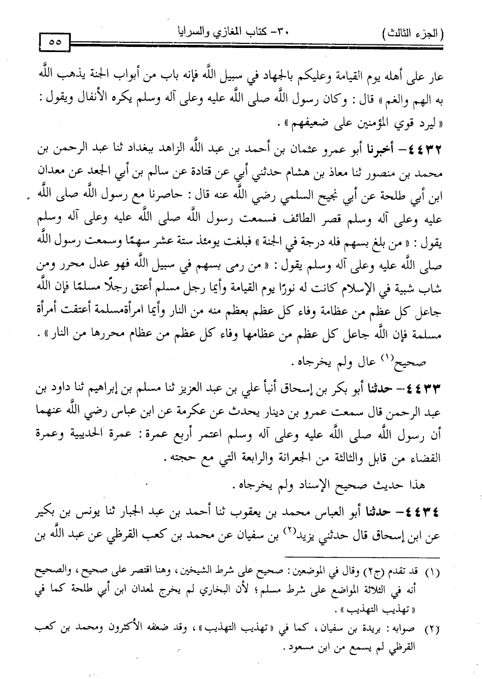 4432 - أَخْبَرَنَا أَبُو عَمْرٍو عُثْمَانُ بْنُ أَحْمَدَ بْنِ عَبْدِ اللَّهِ الزَّاهِدُ ، بِبَغْدَادَ ، ثنا عَبْدُ الرَّحْمَنِ بْنُ مُحَمَّدِ بْنِ مَنْصُورٍ ، ثنا مُعَاذُ بْنُ هِشَامٍ ، حَدَّثَنِي أَبِي ، عَنْ قَتَادَةَ ، عَنْ سَالِمِ بْنِ أَبِي الْجَعْدِ ، عَنْ مَعْدَانَ بْنِ أَبِي طَلْحَةَ ، عَنْ أَبِي نَجِيحٍ السُّلَمِيِّ رَضِيَ اللَّهُ عَنْهُ قَالَ: حَاصَرْنَا مَعَ رَسُولِ اللَّهِ صَلَّى اللَّهُ عَلَيْهِ وَسَلَّمَ قَصْرَ الطَّائِفِ ، فَسَمِعْتُ رَسُولَ اللَّهِ صَلَّى اللَّهُ عَلَيْهِ وَسَلَّمَ يَقُولُ: " مَنْ بَلَغَ بِسَهْمٍ فَلَهُ دَرَجَةٌ فِي الْجَنَّةِ " فَبَلَغْتُ يَوْمَئِذٍ سِتَّةَ عَشَرَ سَهْمًا "