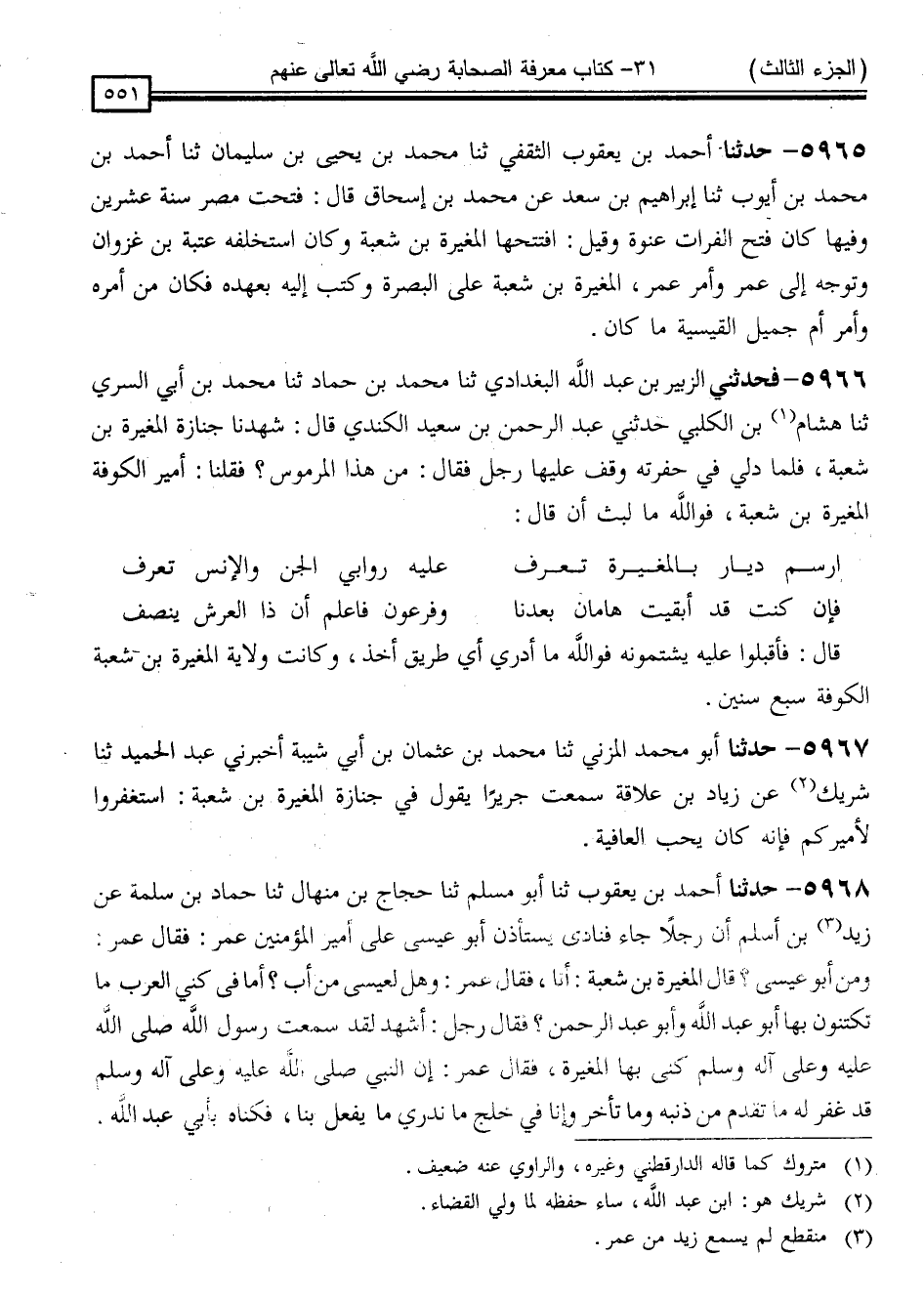 5968 - حَدَّثَنَا أَحْمَدُ بْنُ يَعْقُوبَ ، ثَنَا أَبُو مُسْلِمٍ ، ثَنَا حَجَّاجُ بْنُ مِنْهَالٍ ، ثَنَا حَمَّادُ بْنُ سَلَمَةَ ، عَنْ زَيْدِ بْنِ أَسْلَمَ ، أَنَّ رَجُلًا جَاءَ ، فَنَادَى يَسْتَأْذِنُ أَبُو عِيسَى عَلَى أَمِيرِ الْمُؤْمِنِينَ عُمَرَ ، فَقَالَ عُمَرُ: وَمَنْ أَبُوعِيسَى ؟ قَالَ الْمُغِيرَةُ بْنُ شُعْبَةَ: أَنَا ، فَقَالَ عُمَرُ: وَهَلْ لِعِيسَى مِنْ أَبٍ أَمَا فِي كُنَى الْعَرَبِ مَا تَكْتَنُونَ بِهَا أَبُو عَبْدِ اللَّهِ ، وَأَبُو عَبْدِ الرَّحْمَنِ ، فَقَالَ رَجُلٌ: " أَشْهَدُ لَقَدْ سَمِعْتُ رَسُولَ اللَّهِ صَلَّى اللَّهُ عَلَيْهِ وَسَلَّمَ يُكَنِّي بِهَا الْمُغِيرَةَ " ، فَقَالَ عُمَرُ: إِنَّ النَّبِيَّ صَلَّى اللَّهُ عَلَيْهِ وَسَلَّمَ قَدْ غُفِرَ لَهُ مَا تَقَدَّمَ مِنْ ذَنْبِهِ وَمَا تَأَخَّرَ ، وَإِنَّا فِي خْلَجٍ مَا نَدْرِي مَا يُفْعَلُ بِنَا ، فَكَنَّاهُ بِأَبِي عَبْدِ اللَّهِ