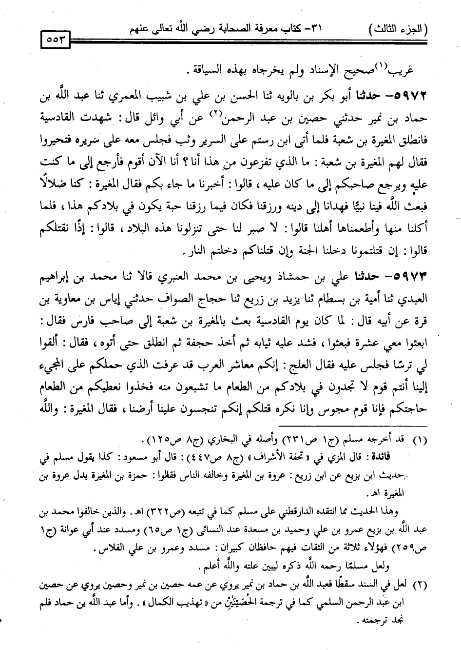 5972 - حَدَّثَنَا أَبُو بَكْرِ بْنُ بَالَوَيْهِ ، ثَنَا الْحَسَنُ بْنُ عَلِيِّ بْنِ شَبِيبٍ الْمَعْمَرِيُّ ، ثَنَا عَبْدُ اللَّهِ بْنُ حَمَّادِ بْنِ نُمَيْرٍ ، حَدَّثَنِي حُصَيْنُ بْنُ عَبْدِ الرَّحْمَنِ ، عَنْ أَبِي وَائِلٍ ، قَالَ: شَهِدْتُ الْقَادِسِيَّةَ فَانْطَلَقَ الْمُغِيرَةُ بْنُ شُعْبَةَ ، فَلَمَّا أَتَى ابْنَ رُسْتُمَ عَلَى السَّرِيرِ وَثَبَ ، فَجَلَسَ مَعَهُ عَلَى سَرِيرِهِ فَتَحَيَّرُوا ، فَقَالَ لَهُمُ الْمُغِيرَةُ بْنُ شُعْبَةُ: " مَا الَّذِي تَفْزَعُونَ مِنْ هَذَا ؟ أَنَا أَنَا الْآنَ أَقُومُ ، فَأَرْجِعُ إِلَى مَا كُنْتُ عَلَيْهِ وَيَرْجِعُ صَاحِبُكُمْ إِلَى مَا كَانَ عَلَيْهِ " . قَالُوا: أَخْبَرَنَا مَا جَاءَ بِكُمْ ؟ فَقَالَ الْمُغِيرَةُ: " كُنَّا ضُلَّالًا فَبَعَثَ اللَّهُ فِينَا نَبِيًّا فَهَدَانَا إِلَى دِينِهِ وَرَزَقَنَا ، فَكَانَ فِيمَا رَزَقَنَا حَبَّةٌ يَكُونُ فِي بِلَادِكُمْ هَذَا ، فَلَمَّا أَكَلْنَا مِنْهَا وَأَطْعَمْنَاهَا أَهْلَنَا " . قَالُوا: لَا صَبْرَ لَنَا حَتَّى تُنْزِلُونَا هَذِهِ الْبِلَادَ ، قَالُوا: إِذًا نَقْتُلُكُمْ ، قَالُوا: إِنَّ قَتَلْتُمُونَا دَخَلْنَا الْجَنَّةَ ، وَإِنْ قَتَلْنَاكُمْ دَخَلْتُمُ النَّارَ