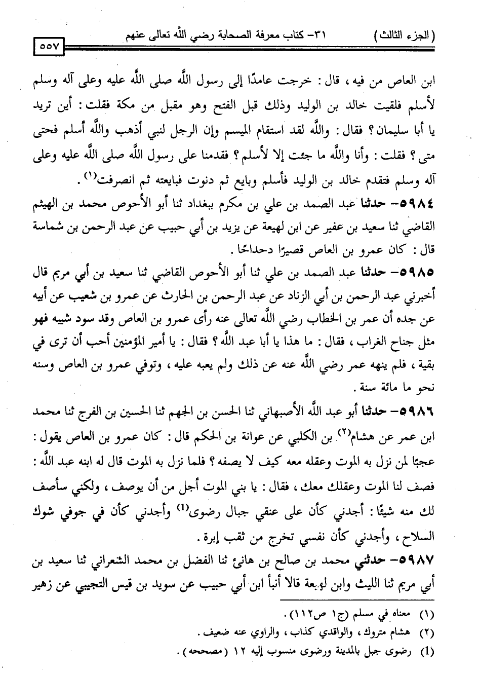 5986 - حَدَّثَنَا أَبُو عَبْدِ اللَّهِ الْأَصْبَهَانِيُّ ، ثَنَا الْحَسَنُ بْنُ الْجَهْمِ ، ثَنَا الْحُسَيْنُ بْنُ الْفَرَجِ ، ثَنَا مُحَمَّدُ بْنُ عُمَرَ ، عَنْ هِشَامِ بْنِ الْكَلْبِيِّ ، عَنْ عَوَانَةَ بْنِ الْحَكَمِ ، قَالَ: كَانَ عَمْرُو بْنُ الْعَاصِ يَقُولُ: " عَجَبًا لِمَنْ نَزَلَ بِهِ الْمَوْتُ ، وَعَقْلُهُ مَعَهُ كَيْفَ لَا يَصِفُهُ " ، فَلَمَّا نَزَلَ بِهِ الْمَوْتُ ، قَالَ لَهُ ابْنُهُ عَبْدُ اللَّهِ: فَصِفْ لَنَا الْمَوْتَ وَعَقْلُكَ مَعَكَ . فَقَالَ: " يَا بُنَيَّ ، الْمَوْتُ أَجَلُّ مِنْ أَنْ يُوصَفَ ، وَلَكِنِّي سَأَصِفُ لَكَ مِنْهُ شَيْئًا أَجِدُنِي كَأَنَّ عَلَى عُنُقِي جِبَالُ رَضْوَى ، وَأَجِدُنِي كَأَنَّ فِي جَوْفِي شَوْكُ السِّلَاحِ ، وَأَجِدُنِي كَأَنَّ نَفْسِي تَخْرُجُ مِنْ ثَقْبِ إِبْرَةٍ "