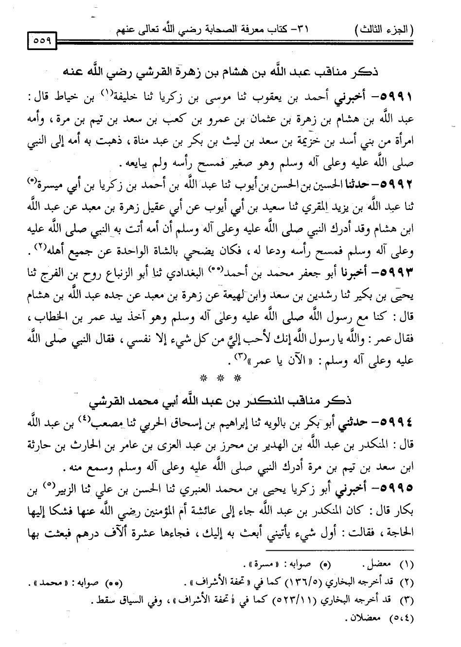 5995 - أَخْبَرَنِي أَبُو زَكَرِيَّا يَحْيَى بْنُ مُحَمَّدٍ الْعَنْبَرِيُّ ، ثَنَا الْحَسَنُ بْنُ عَلِيٍّ ، ثَنَا الزُّبَيْرُ بْنُ بَكَّارٍ ، قَالَ: كَانَ الْمُنْكَدِرُ بْنُ عَبْدِ اللَّهِ جَاءَ إِلَى عَائِشَةَ أُمِّ الْمُؤْمِنِينَ رَضِيَ اللَّهُ عَنْهَا ، فَشَكَا إِلَيْهَا الْحَاجَةَ ، فَقَالَتْ: " أَوَّلُ شَيْءٍ يَأْتِينِي أَبْعَثُ بِهِ إِلَيْكَ " فَجَاءَهَا عَشَرَةُ أَلْفِ دِرْهَمٍ ، فَبَعَثَتْ بِهَا -[560]- إِلَيْهِ ، فَأَخَذَ مِنْهَا جَارِيَةً فَوَلَدَتْ لَهُ بَنِيهِ: مُحَمَّدًا ، وَأَبَا بَكْرٍ ، وَعُمَرَ ، وَذُكِرُوا كُلُّهُمْ بِالصَّلَاحِ ، وَحُمِلَ عَنْهُمُ الْحَدِيثُ