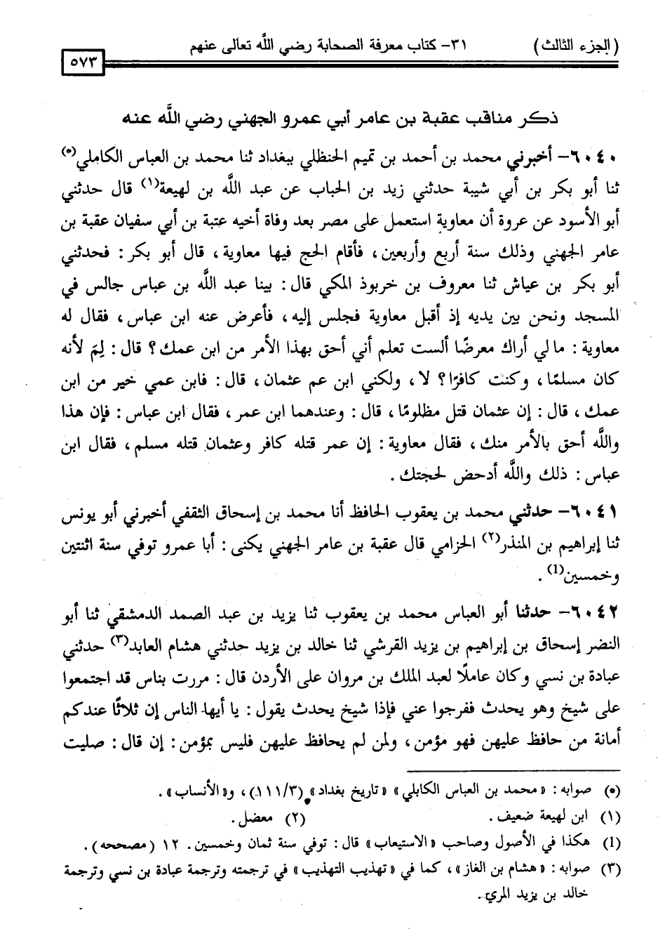 6042 - حَدَّثَنَا أَبُو الْعَبَّاسِ مُحَمَّدُ بْنُ يَعْقُوبَ ، ثَنَا يَزِيدُ بْنُ عَبْدِ الصَّمَدِ الدِّمَشْقِيُّ ، ثَنَا أَبُو النَّضْرِ إِسْحَاقُ بْنُ إِبْرَاهِيمَ بْنِ يَزِيدَ الْقُرَشِيُّ ، ثَنَا خَالِدُ بْنُ يَزِيدَ ، حَدَّثَنِي هِشَامٌ الْعَابِدُ * ، حَدَّثَنِي عُبَادَةُ بْنُ نُسَيٍّ ، وَكَانَ عَامِلًا لِعَبْدِ الْمَلِكِ بْنِ مَرْوَانَ عَلَى الْأُرْدُنِّ ، قَالَ: مَرَرْتُ بِنَاسٍ قَدِ اجْتَمَعُوا عَلَى شَيْخٍ وَهُوَ يُحَدِّثُ ، فَفَرَّجُوا عَنِّي ، فَإِذَا شَيْخٌ يُحَدِّثُ ، يَقُولُ: " يَا أَيُّهَا النَّاسُ ، إِنَّ ثَلَاثًا عِنْدَكُمْ أَمَانَةٌ مَنْ حَافَظَ عَلَيْهِنَّ فَهُوَ مُؤْمِنٌ ، وَمَنْ لَمْ يُحَافِظْ عَلَيْهِنَّ فَلَيْسَ بِمُؤْمِنٍ إِنْ قَالَ: صَلَّيْتُ -[574]- وَلَمْ يُصَلِّ ، وَصُمْتُ وَلَمْ يَصُمْ ، وَاغْتَسَلْتُ مِنَ الْجَنَابَةِ وَلَمْ يَغْتَسِلْ " . قَالَ: فَقَالَ مَنْ يَمِينِي: مَنْ هَذَا ؟ قَالَ: عُقْبَةُ بْنُ عَامِرٍ الْجُهَنِيُّ صَاحِبُ رَسُولِ اللَّهِ صَلَّى اللَّهُ عَلَيْهِ وَسَلَّمَ