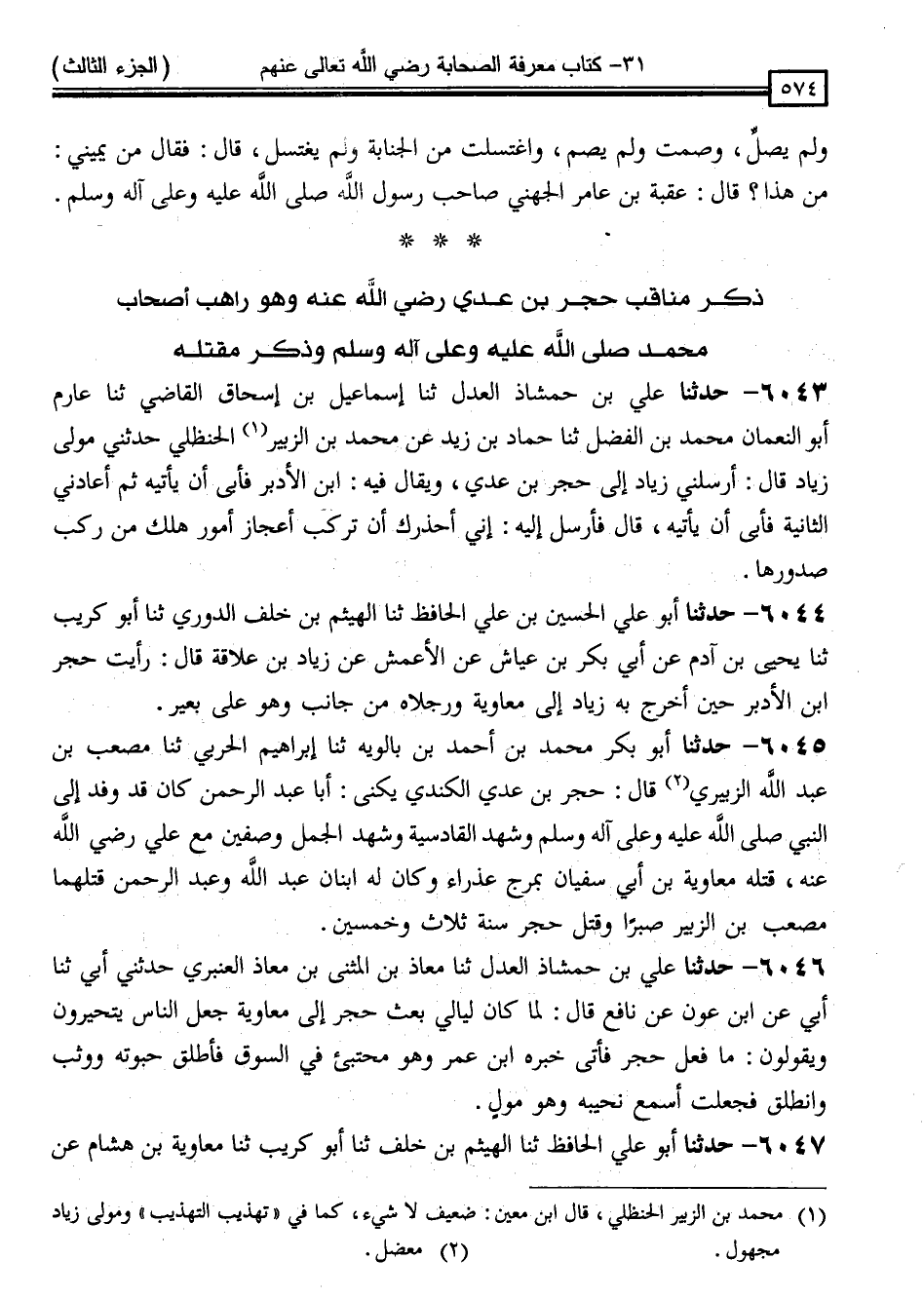 6045 - حَدَّثَنَا أَبُو بَكْرٍ مُحَمَّدُ بْنُ أَحْمَدَ بْنِ بَالَوَيْهِ ، ثنا إِبْرَاهِيمُ الْحَرْبِيُّ ، ثنا مُصْعَبُ بْنُ عَبْدِ اللَّهِ الزُّبَيْرِيُّ ، قَالَ: " حُجْرُ بْنُ عَدِيٍّ الْكِنْدِيُّ يُكَنَّى أَبَا عَبْدِ الرَّحْمَنِ ، كَانَ قَدْ وَفَدَ إِلَى النَّبِيِّ صَلَّى اللَّهُ عَلَيْهِ وَسَلَّمَ ، وَشَهِدَ الْقَادِسِيَّةَ ، وَشَهِدَ الْجَمَلَ ، وَصِفِّينَ مَعَ عَلِيٍّ رَضِيَ اللَّهُ عَنْهُ قَتَلَهُ مُعَاوِيَةُ بْنُ أَبَى سُفْيَانَ بِمَرْجِ عَذْرَاءَ ، وَكَانَ لَهُ ابْنَانِ: عَبْدُ اللَّهِ ، وَعَبْدُ الرَّحْمَنِ قَتَلَهُمَا مُصْعَبُ بْنُ الزُّبَيْرِ صَبْرًا ، وَقُتِلَ حُجْرٌ سَنَةَ ثَلَاثٍ وَخَمْسِينَ "
