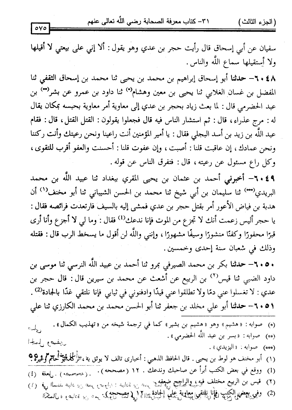 6048 - حَدَّثَنَا أَبُو إِسْحَاقَ إِبْرَاهِيمُ بْنُ مُحَمَّدِ بْنِ يَحْيَى ، ثنا مُحَمَّدُ بْنُ إِسْحَاقَ الثَّقَفِيُّ ، ثنا الْمُفَضَّلُ بْنُ غَسَّانَ الْغَلَابِيُّ ، ثنا يَحْيَى بْنُ مَعِينٍ ، وَهِشَامٌ ، ثنا دَاوُدُ بْنُ عَمْرٍو ، عَنْ بِشْرِ بْنِ عَبْدٍ الْحَضْرَمِيِّ ، قَالَ: لَمَّا بَعَثَ زِيَادٌ بِحُجْرِ بْنِ عَدِيٍّ إِلَى مُعَاوِيَةَ أَمَرَ مُعَاوِيَةُ بِحَبْسِهِ بِمَكَانٍ يُقَالُ لَهُ: مَرْجُ عَذْرَاءَ ، ثُمَّ اسْتَشَارَ النَّاسَ فِيهِ قَالَ: فَجَعَلُوا يَقُولُونَ: الْقَتْلُ الْقَتْلُ . قَالَ: فَقَامَ عَبْدُ اللَّهِ بْنُ زَيْدِ بْنِ أَسَدٍ الْبَجَلِيُّ فَقَالَ: " يَا أَمِيرَ الْمُؤْمِنِينَ ، أَنْتَ رَاعِينَا وَنَحْنُ رَعِيَّتُكَ ، وَأَنْتَ رُكْنُنَا وَنَحْنُ عِمَادُكَ ، إِنْ عَاقَبْتَ قُلْنَا: أَصَبْتَ ، وَإِنْ عَفَوْتَ قُلْنَا: أَحْسَنْتَ وَالْعَفْوُ أَقْرَبُ لِلتَّقْوَى ، وَكُلُّ رَاعٍ مَسْئُولٌ عَنْ رَعِيَّتِهِ " قَالَ: فَتَفَرَّقَ النَّاسُ عَنْ قَوْلِهِ