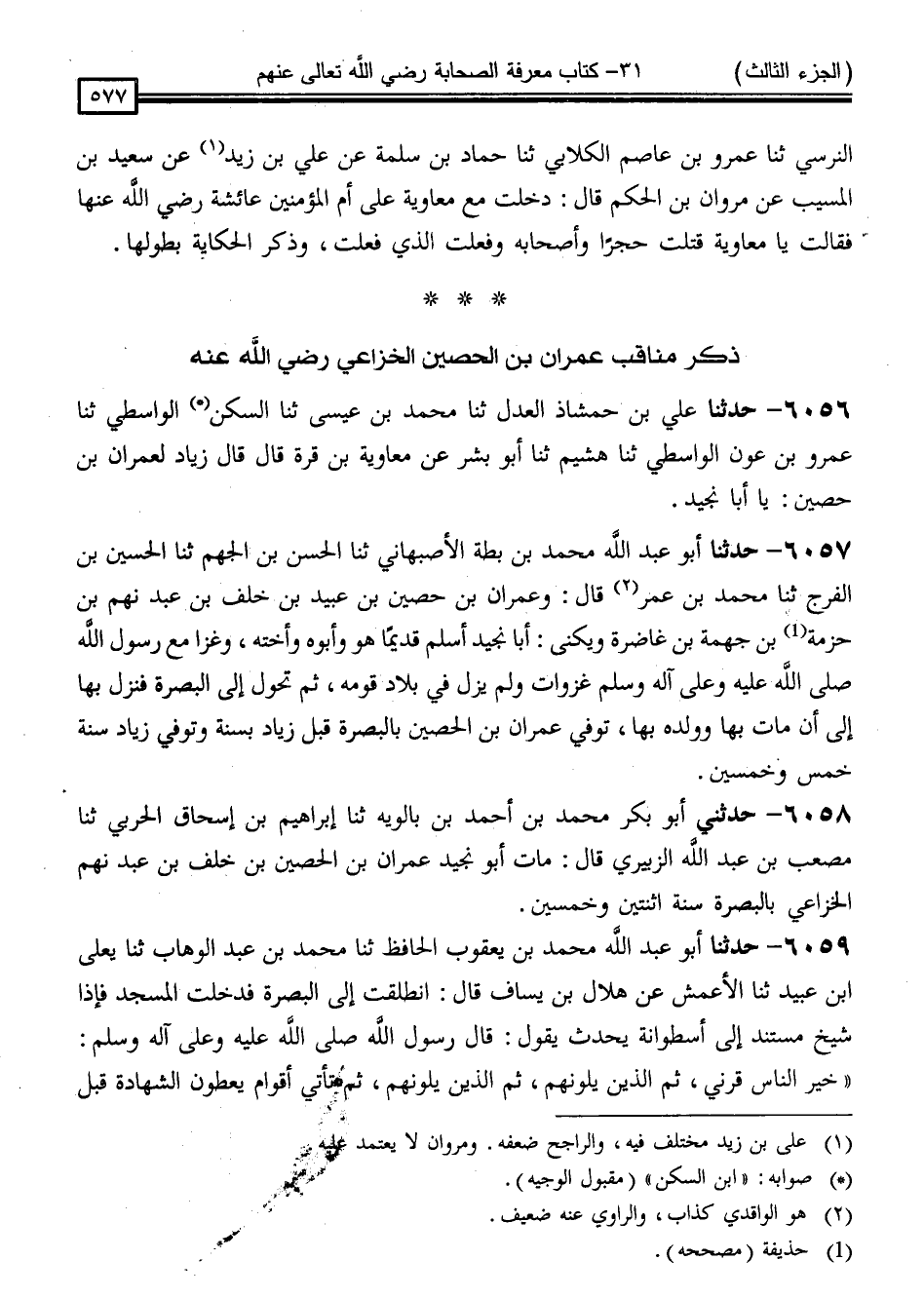 6057 - حَدَّثَنَا أَبُو عَبْدِ اللَّهِ مُحَمَّدُ [بْنُ أَحْمَدَ] بْنِ بُطَّةَ الْأَصْبَهَانِيُّ ، ثَنَا الْحَسَنُ بْنُ الْجَهْمِ ، ثَنَا الْحُسَيْنُ بْنُ الْفَرَجِ ، ثَنَا مُحَمَّدُ بْنُ عُمَرَ ، قَالَ: " وَعِمْرَانُ بْنُ حُصَيْنِ بْنِ عُبَيْدِ بْنِ خَلَفِ بْنِ عَبْدِ نَهِمِ بْنِ حُزْمَةَ بْنِ جَهْمَةَ بْنِ غَاضِرَةَ وَيُكَنَّى أَبَا نُجَيْدٍ ، أَسْلَمَ قَدِيمًا هُوَ وَأَبُوهُ وَأُخْتُهُ ، وَغَزَا مَعَ رَسُولِ اللَّهِ صَلَّى اللَّهُ عَلَيْهِ وَسَلَّمَ غَزَوَاتٍ ، وَلَمْ يَزَلْ فِي بِلَادِ قَوْمِهِ ، ثُمَّ تَحَوَّلَ إِلَى الْبَصْرَةِ ، فَنَزَلَ بِهَا إِلَى أَنْ مَاتَ بِهَا ، وَوَلَدُهُ بِهَا ، وَتُوُفِّيَ عِمْرَانُ بْنُ الْحُصَيْنِ بِالْبَصْرَةِ قَبْلَ زِيَادٍ بِسَنَةٍ ، وَتُوُفِّيَ زِيَادٌ سَنَةَ خَمْسٍ وَخَمْسِينَ "