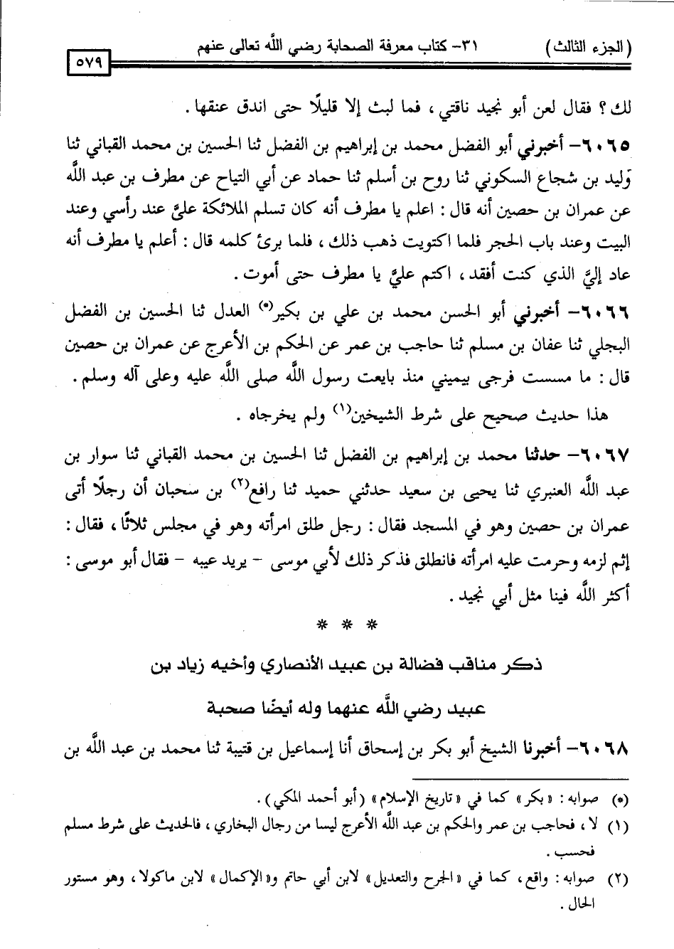 6066 - أَخْبَرَنِي أَبُو الْحَسَنِ مُحَمَّدُ بْنُ عَلِيِّ بْنِ بُكَيْرٍ * الْعَدْلُ ، ثَنَا الْحُسَيْنُ بْنُ الْفَضْلِ الْبَجَلِيُّ ، ثَنَا عَفَّانُ بْنُ مُسْلِمٍ ، ثَنَا حَاجِبُ بْنُ عُمَرَ ، عَنِ الْحَكَمِ بْنِ الْأَعْرَجِ ، عَنْ عِمْرَانَ بْنِ حُصَيْنٍ ، قَالَ: " مَا مَسِسْتُ فَرْجِي بِيَمِينِي مُنْذُ بَايَعْتُ رَسُولَ اللَّهِ صَلَّى اللَّهُ عَلَيْهِ وَسَلَّمَ "