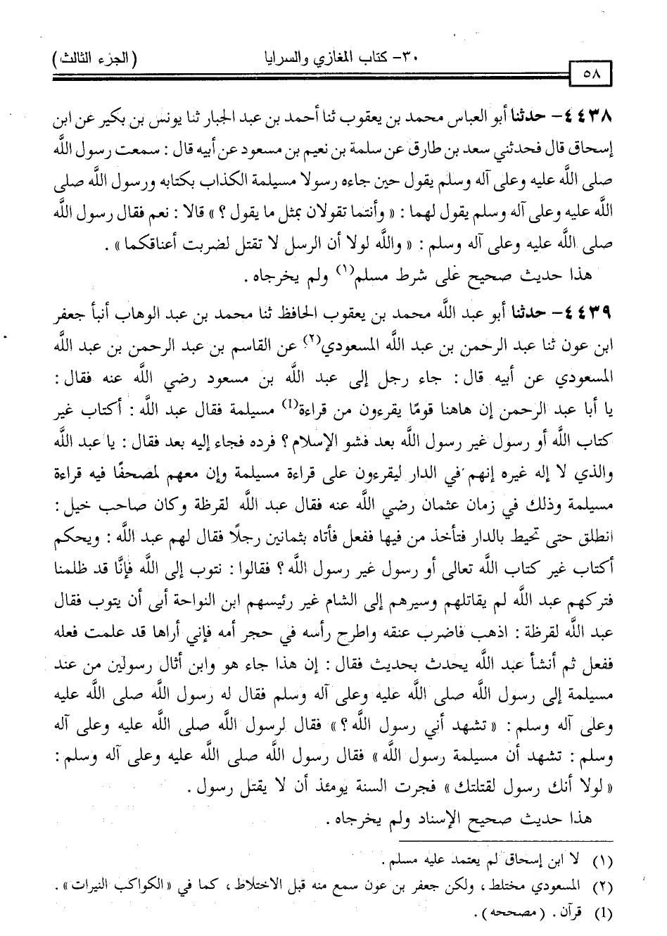 4439 - حَدَّثَنَا أَبُو عَبْدِ اللَّهِ مُحَمَّدُ بْنُ يَعْقُوبَ الْحَافِظُ ، ثنا مُحَمَّدُ بْنُ عَبْدِ الْوَهَّابِ ، أَنْبَأَ جَعْفَرُ بْنُ عَوْنٍ ، ثنا عَبْدُ الرَّحْمَنِ بْنُ عَبْدِ اللَّهِ الْمَسْعُودِيُّ ، عَنِ الْقَاسِمِ بْنِ عَبْدِ الرَّحْمَنِ بْنِ عَبْدِ اللَّهِ الْمَسْعُودِيِّ ، عَنْ أَبِيهِ قَالَ: جَاءَ رَجُلٌ إِلَى عَبْدِ اللَّهِ بْنِ مَسْعُودٍ رَضِيَ اللَّهُ عَنْهُ ، فَقَالَ: يَا أَبَا عَبْدِ الرَّحْمَنِ ، إِنَّ هَا هُنَا قَوْمًا يَقْرَءُونَ مِنْ قِرَاءَةِ مُسَيْلِمَةَ ، فَقَالَ عَبْدُ اللَّهِ: " أَكِتَابٌ غَيْرُ كِتَابِ اللَّهِ ، أَوْ رَسُولٌ غَيْرُ رَسُولِ اللَّهِ بَعْدَ فَشْوِ الْإِسْلَامِ ؟ " فَرَدَّهُ فَجَاءَ إِلَيْهِ بَعْدُ ، فَقَالَ: يَا عَبْدَ اللَّهِ ، وَالَّذِي لَا إِلَهَ غَيْرُهُ أَنَّهُمْ فِي الدَّارِ لَيَقْرَءُونَ عَلَى قِرَاءَةِ مُسَيْلِمَةَ ، وَإِنَّ مَعَهُمْ لَمُصْحَفًا فِيهِ قِرَاءَةُ مُسَيْلِمَةَ ، وَذَلِكَ فِي زَمَانِ عُثْمَانَ رَضِيَ اللَّهُ عَنْهُ ، فَقَالَ عَبْدُ اللَّهِ لَقَرَظَةَ وَكَانَ صَاحِبَ خَيْلٍ: " انْطَلِقْ حَتَّى تُحِيطَ بِالدَّارِ فَتَأْخُذَ مَنْ فِيهَا " ، فَفَعَلَ فَأَتَاهُ بِثَمَانِينَ رَجُلًا ، فَقَالَ لَهُمْ عَبْدُ اللَّهِ: " وَيْحَكُمْ أَكِتَابٌ غَيْرُ كِتَابِ اللَّهِ تَعَالَى ، أَوْ رَسُولٌ غَيْرُ رَسُولِ اللَّهِ ؟ " فَقَالُوا: نَتُوبُ إِلَى اللَّهِ ، فَإِنَّا قَدْ ظَلَمْنَا ، فَتَرَكَهُمْ عَبْدُ اللَّهِ لَمْ يُقَاتِلْهُمْ ، وَسَيَّرَهُمْ إِلَى الشَّامِ ، غَيْرَ رَئِيسَهُمُ ابْنِ النَّوَّاحَةِ أَبَى أَنْ يَتُوبَ ، فَقَالَ عَبْدُ اللَّهِ لَقَرَظَةَ: " اذْهَبْ فَاضْرِبْ عُنُقَهُ ، وَاطْرَحْ رَأْسَهُ فِي حِجْرِ أُمِّهِ ، فَإِنِّي أُرَاهَا قَدْ عَلِمَتْ فِعْلَهُ فَفَعَلَ "