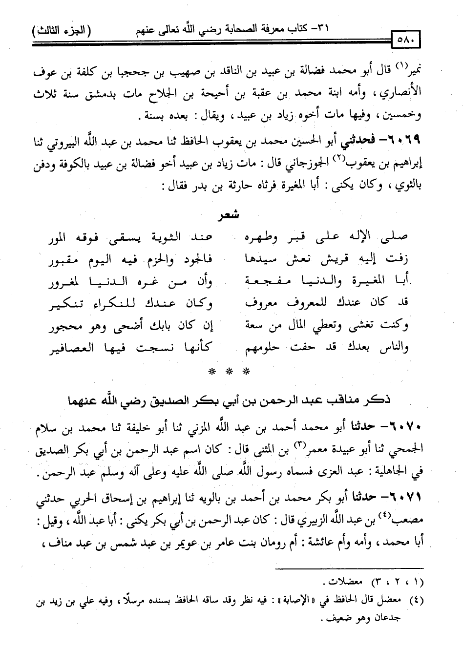 6069 - فَحَدَّثَنِي أَبُو الْحُسَيْنِ مُحَمَّدُ بْنُ يَعْقُوبَ الْحَافِظُ ، ثَنَا مُحَمَّدُ بْنُ عَبْدِ اللَّهِ الْبَيْرُوتِيُّ ، ثَنَا إِبْرَاهِيمُ بْنُ يَعْقُوبَ الْجَوْزَجَانِيُّ ، قَالَ: " مَاتَ زِيَادُ بْنُ عُبَيْدٍ أَخُو فَضَالَةَ بْنِ عُبَيْدٍ بِالْكُوفَةِ ، وَدُفِنَ بِالثَّوَى ، وَكَانَ يُكَنَّى أَبَا الْمُغِيرَةِ ، فَرَثَاهُ حَارِثَةُ بْنُ بَدْرٍ فَقَالَ: "