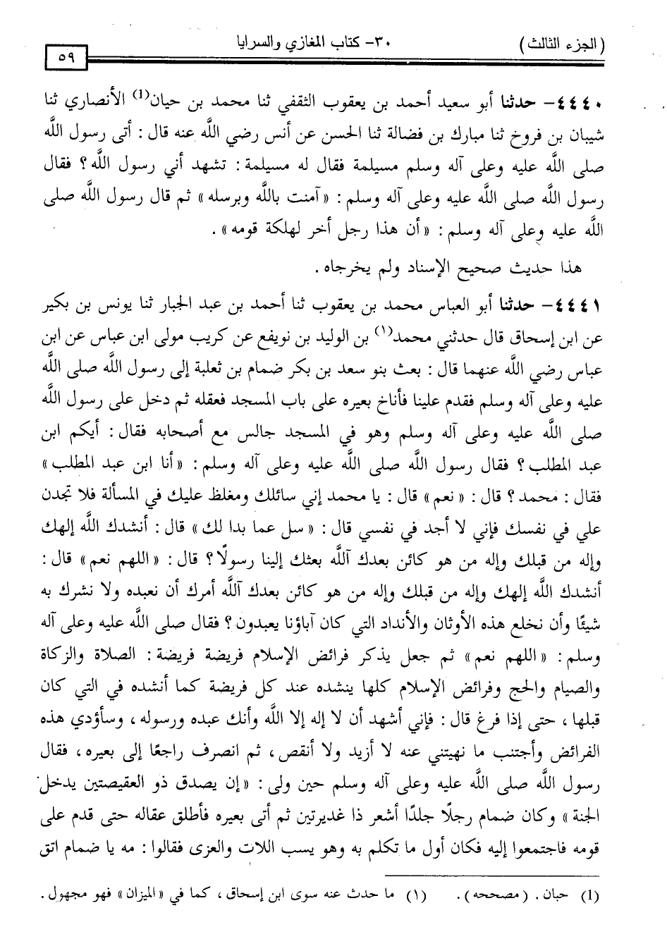 4441 - حَدَّثَنَا أَبُو الْعَبَّاسِ مُحَمَّدُ بْنُ يَعْقُوبَ ، ثنا أَحْمَدُ بْنُ عَبْدِ الْجَبَّارِ ، ثنا يُونُسُ بْنُ بُكَيْرٍ ، عَنِ ابْنِ إِسْحَاقَ ، قَالَ: حَدَّثَنِي مُحَمَّدُ بْنُ الْوَلِيدِ بْنِ نُوَيْفِعٍ ، عَنْ كُرَيْبٍ ، مَوْلَى ابْنِ عَبَّاسٍ ، عَنِ ابْنِ عَبَّاسٍ رَضِيَ اللَّهُ عَنْهُمَا قَالَ: بَعَثَ بَنُو سَعْدِ بْنِ بَكْرٍ ضِمَامَ بْنَ ثَعْلَبَةَ إِلَى رَسُولِ اللَّهِ صَلَّى اللَّهُ عَلَيْهِ وَسَلَّمَ ، فَقَدِمَ عَلَيْنَا فَأَنَاخَ بَعِيرَهُ عَلَى بَابِ الْمَسْجِدِ فَعَقَلَهُ ، ثُمَّ دَخَلَ عَلَى رَسُولِ اللَّهِ صَلَّى اللَّهُ عَلَيْهِ وَسَلَّمَ وَهُوَ فِي الْمَسْجِدِ جَالِسٌ مَعَ أَصْحَابِهِ ، فَقَالَ: أَيُّكُمُ ابْنُ عَبْدِ الْمُطَّلِبِ قَالَ رَسُولُ اللَّهِ صَلَّى اللَّهُ عَلَيْهِ وَسَلَّمَ: " أَنَا ابْنُ عَبْدِ الْمُطَّلِبِ فَقَالَ: مُحَمَّدٌ ؟ قَالَ: " نَعَمْ " قَالَ: يَا مُحَمَّدُ ، إِنِّي سَائِلُكَ وَمُغَلِّظٌ عَلَيْكَ فِي الْمَسْأَلَةِ ، فَلَا تَجِدَنَّ عَلَيَّ فِي نَفْسِكَ ، فَإِنِّي لَا أَجِدُ فِي نَفْسِي ، قَالَ: " سَلْ عَمَّا بَدَا لَكَ " قَالَ: أَنْشُدُكَ اللَّهَ ، إِلَهَكَ وَإِلَهَ مَنْ قَبْلَكَ ، وَإِلَهَ مَنْ هُوَ كَائِنٌ بَعْدَكَ ، آللَّهُ بَعَثَكَ إِلَيْنَا رَسُولًا ؟ قَالَ: " اللَّهُمَّ نَعَمْ " ، قَالَ: أَنْشُدُكَ اللَّهَ إِلَهَكَ ، وَإِلَهَ مَنْ قَبْلَكَ ، وَإِلَهَ مَنْ هُوَ كَائِنٌ بَعْدَكَ ، آللَّهُ أَمَرَكَ أَنْ نَعْبُدَهُ وَلَا نُشْرِكَ بِهِ شَيْئًا ، وَأَنْ نَخْلَعَ هَذِهِ الْأَوْثَانَ وَالْأَنْدَادَ الَّتِي كَانَ آبَاؤُنَا يَعْبُدُونَ ؟ فَقَالَ صَلَّى اللَّهُ عَلَيْهِ وَسَلَّمَ اللَّهُمَّ: " نَعَمْ " ثُمَّ جَعَلَ يَذْكُرُ فَرَائِضَ الْإِسْلَامِ فَرِيضَةً فَرِيضَةً الصَّلَاةَ ، وَالزَّكَاةَ ، وَالصِّيَامَ ، وَالْحَجَّ ، وَفَرَائِضَ الْإِسْلَامِ ، كُلَّهَا يَنْشُدُهُ عِنْدَ كُلِّ فَرِيضَةٍ كَمَا أَنْشُدُهُ فِي الَّتِي كَانَ قَبْلَهَا حَتَّى إِذَا فَرَغَ ، قَالَ: فَإِنِّي أَشْهَدُ أَنَّ لَا إِلَهَ إِلَّا اللَّهُ ، وَأَنَّكَ عَبْدُهُ وَرَسُولُهُ وَسَأُؤَدِّي هَذِهِ الْفَرَائِضَ ، وَأَجْتَنِبُ مَا نَهَيْتَنِي عَنْهُ لَا أَزِيدُ وَلَا أَنْقُصُ ، ثُمَّ انْصَرَفَ رَاجِعًا إِلَى بَعِيرِهِ ، فَقَالَ رَسُولُ اللَّهِ صَلَّى اللَّهُ عَلَيْهِ وَسَلَّمَ حِينَ وَلَّى : " إِنْ يَصْدُقْ ذُو الْعَقِيصَتَيْنِ يَدْخُلِ الْجَنَّةَ " وَكَانَ ضِمَامُ رَجُلًا جَلْدًا أَشْعَرَ ذَا غَدِيرَتَيْنِ ، ثُمَّ أَتَى بَعِيرَهُ ، فَأَطْلَقَ عِقَالَهُ حَتَّى قَدِمَ عَلَى قَوْمِهِ ، فَاجْتَمَعُوا إِلَيْهِ فَكَانَ أَوَّلُ مَا تَكَلَّمَ بِهِ وَهُوَ يَسُبُّ اللَّاتَ وَالْعُزَّى ، فَقَالُوا: مَهْ يَا ضِمَامُ ، اتَّقِ -[60]- الْبَرَصَ ، وَالْجُذَامَ ، وَالْجُنُونَ ، فَقَالَ: وَيْلَكُمْ إِنَّهُمَا وَاللَّهِ لَا يَضُرَّانِ وَلَا يَنْفَعَانِ ، إِنَّ اللَّهَ قَدْ بَعَثَ رَسُولًا ، وَأَنْزَلَ عَلَيْهِ كِتَابًا اسْتَنْقَذَكُمْ بِهِ مِمَّا كُنْتُمْ فِيهِ ، وَإِنِّي أَشْهَدُ أَنَّ لَا إِلَهَ إِلَّا اللَّهُ ، وَأَنَّ مُحَمَّدًا عَبْدُهُ وَرَسُولُهُ ، وَإِنِّي قَدْ جِئْتُكُمْ مِنْ عِنْدِهُ بِمَا أَمَرَكُمْ بِهِ وَنَهَاكُمْ عَنْهُ ، فَوَاللَّهِ مَا أَمْسَى ذَلِكَ الْيَوْمَ مِنْ حَاضِرَتِهِ رَجُلٌ وَلَا امْرَأَةٌ إِلَّا مُسْلِمًا ، قَالَ ابْنُ عَبَّاسٍ رَضِيَ اللَّهُ عَنْهُمَا: فَمَا سَمِعْنَا بِوَافِدِ قَوْمٍ كَانَ أَفْضَلَ مِنْ ضِمَامِ بْنِ ثَعْلَبَةَ رَضِيَ اللَّهُ عَنْهُ " وَقَدِ اتَّفَقَ الشَّيْخَانِ عَلَى إِخْرَاجِ وُرُودِ ضِمَامٍ الْمَدِينَةَ وَلَمْ يَسُقْ وَاحِدٌ مِنْهُمَا الْحَدِيثَ بِطُولِهِ ، وَهَذَا صَحِيحٌ "