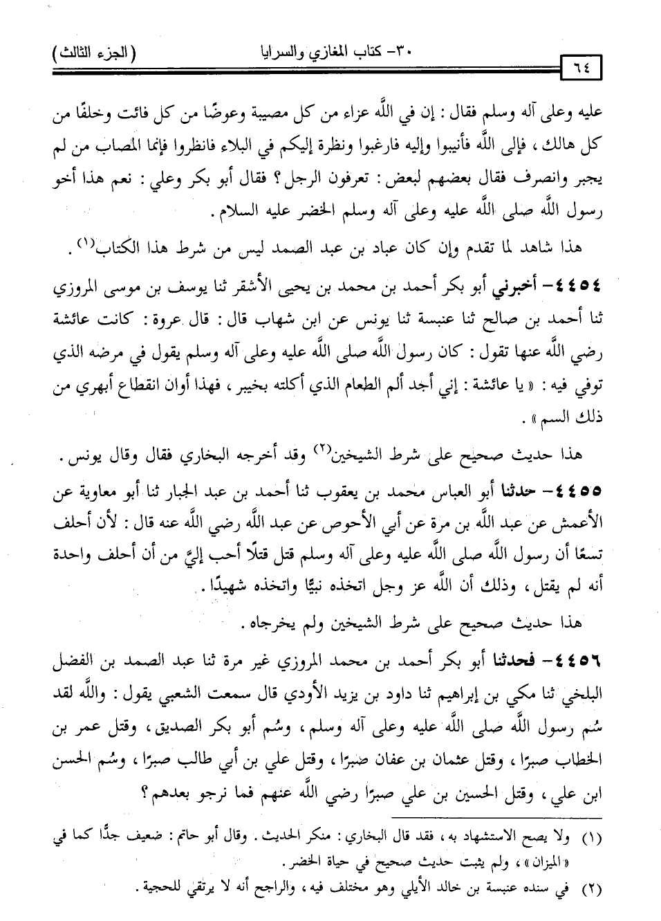4456 - فَحَدَّثَنَا أَبُو بَكْرٍ أَحْمَدُ بْنُ مُحَمَّدٍ * الْمَرْوَزِيُّ غَيْرَ مَرَّةٍ ، ثنا عَبْدُ الصَّمَدِ بْنُ الْفَضْلِ الْبَلْخِيُّ ، ثنا مَكِّيُّ بْنُ إِبْرَاهِيمَ ، ثنا دَاوُدُ بْنُ يَزِيدَ الْأَوْدِيُّ ، قَالَ: سَمِعْتُ الشَّعْبِيَّ يَقُولُ: " وَاللَّهِ لَقَدْ سُمَّ رَسُولُ اللَّهِ صَلَّى اللَّهُ عَلَيْهِ وَسَلَّمَ ، وَسُمَّ أَبُو بَكْرٍ الصِّدِّيقُ ، وَقُتِلَ عُمَرُ بْنُ الْخَطَّابِ صَبْرًا ، وَقُتِلَ عُثْمَانُ بْنُ عَفَّانَ صَبْرًا ، وَقُتِلَ عَلِيُّ بْنُ أَبِي طَالِبٍ صَبْرًا ، وَسُمَّ الْحَسَنُ بْنُ عَلِيٍّ ، وَقُتِلَ الْحُسَيْنُ بْنُ عَلِيٍّ صَبْرًا ، رَضِيَ اللَّهُ عَنْهُمْ فَمَا نَرْجُو بَعْدَهُمْ "
