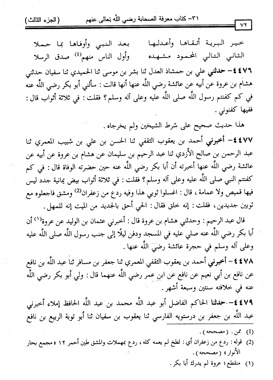 4476 - حَدَّثَنِي عَلِيُّ بْنُ حَمْشَاذَ الْعَدْلُ ، الْعَدْلُ ، ثنا بِشْرُ بْنُ مُوسَى ، ثنا الْحُمَيْدِيُّ ، ثنا سُفْيَانُ ، حَدَّثَنِي هِشَامُ بْنُ عُرْوَةَ ، عَنْ أَبِيهِ ، عَنْ عَائِشَةَ رَضِيَ اللَّهُ عَنْهَا أَنَّهَا قَالَتْ: سَأَلَنِي أَبُو بَكْرٍ رَضِيَ اللَّهُ عَنْهُ: فِي كَمْ كَفَّنْتُمْ رَسُولَ اللَّهِ صَلَّى اللَّهُ عَلَيْهِ وَسَلَّمَ ؟ فَقُلْتُ: " فِي ثَلَاثَةِ أَثْوَابٍ " ، قَالَ: فَفِيهَا كَفِّنُونِي