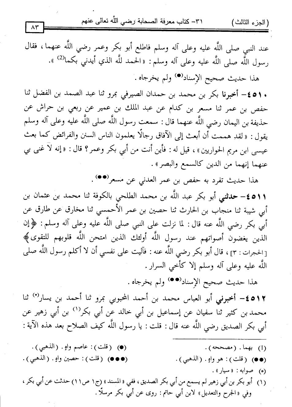 4511 - حَدَّثَنِي أَبُو بَكْرٍ عَبْدُ اللَّهِ بْنُ مُحَمَّدٍ الطَّلْحِيُّ ، بِالْكُوفَةِ ، ثنا مُحَمَّدُ بْنُ عُثْمَانَ بْنِ أَبِي شَيْبَةَ ، ثنا مِنْجَابُ بْنُ الْحَارِثِ ، ثنا حُصَيْنُ بْنُ عُمَرَ الْأَحْمَسِيُّ ، ثنا مُخَارِقُ ، عَنْ طَارِقٍ ، عَنْ أَبِي بَكْرٍ رَضِيَ اللَّهُ عَنْهُ قَالَ: لَمَّا نَزَلَتْ عَلَى النَّبِيِّ صَلَّى اللَّهُ عَلَيْهِ وَسَلَّمَ: { إِنَّ الَّذِينَ يَغُضُّونَ أَصْوَاتَهُمْ عِنْدَ رَسُولِ اللَّهِ أُولَئِكَ الَّذِينَ امْتَحَنَ اللَّهُ قُلُوبَهُمْ لِلتَّقْوَى } [الحجرات: 3] قَالَ أَبُو بَكْرٍ رَضِيَ اللَّهُ عَنْهُ: " فَآلَيْتُ عَلَى نَفْسِي ، أَنْ لَا أُكَلِّمَ رَسُولَ اللَّهِ صَلَّى اللَّهُ عَلَيْهِ وَسَلَّمَ إِلَّا كَأَخِي السِّرَارِ "