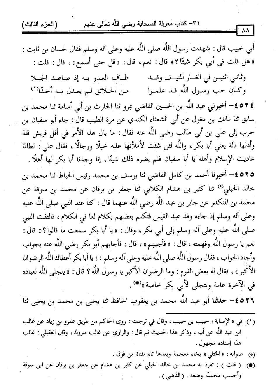 4525 - أَخْبَرَنَا أَحْمَدُ بْنُ كَامِلٍ الْقَاضِي ، ثنا يُوسُفُ بْنُ مُحَمَّدٍ ، رَئِيسُ الْخَيَّاطِ ، ثنا مُحَمَّدُ بْنُ خَالِدٍ الْحُبُلِيُّ ، ثنا كَثِيرُ بْنُ هِشَامٍ الْكِلَابِيُّ ، ثنا جَعْفَرُ بْنُ بُرْقَانَ ، عَنْ مُحَمَّدِ بْنِ سُوقَةَ ، عَنْ مُحَمَّدِ بْنِ الْمُنْكَدِرِ ، عَنْ جَابِرِ بْنِ عَبْدِ اللَّهِ رَضِيَ اللَّهُ عَنْهُمَا ، قَالَ: كُنَّا عِنْدَ النَّبِيِّ صَلَّى اللَّهُ عَلَيْهِ وَسَلَّمَ إِذْ جَاءَهُ وَفْدُ عَبْدِ الْقَيْسِ فَتَكَلَّمَ بَعْضُهُمْ بِكَلَامٍ لَغَا فِي الْكَلَامِ ، فَالْتَفَتَ النَّبِيُّ صَلَّى اللَّهُ عَلَيْهِ وَسَلَّمَ إِلَى أَبِي بَكْرٍ ، وَقَالَ: " يَا أَبَا بَكْرٍ ، سَمِعْتَ مَا قَالُوا ؟ " قَالَ: نَعَمْ يَا رَسُولَ اللَّهِ ، وَفَهِمْتُهُ ، قَالَ: " فَأَجِبْهُمْ " قَالَ: فَأَجَابَهُمْ أَبُو بَكْرٍ رَضِيَ اللَّهُ عَنْهُ بِجَوَابٍ وَأَجَادَ الْجَوَّابَ ، فَقَالَ رَسُولُ اللَّهِ صَلَّى اللَّهُ عَلَيْهِ وَسَلَّمَ: " يَا أَبَا بَكْرٍ ، أَعْطَاكَ اللَّهُ الرِّضْوَانَ الْأَكْبَرَ " فَقَالَ لَهُ بَعْضُ الْقَوْمِ: وَمَا الرِّضْوَانُ الْأَكْبَرُ يَا رَسُولَ اللَّهِ ؟ قَالَ: " يَتَجَلَّى اللَّهُ لِعِبَادِهِ فِي الْآخِرَةِ عَامَّةً ، وَيَتَجَلَّى لِأَبِي بَكْرٍ خَاصَّةً "