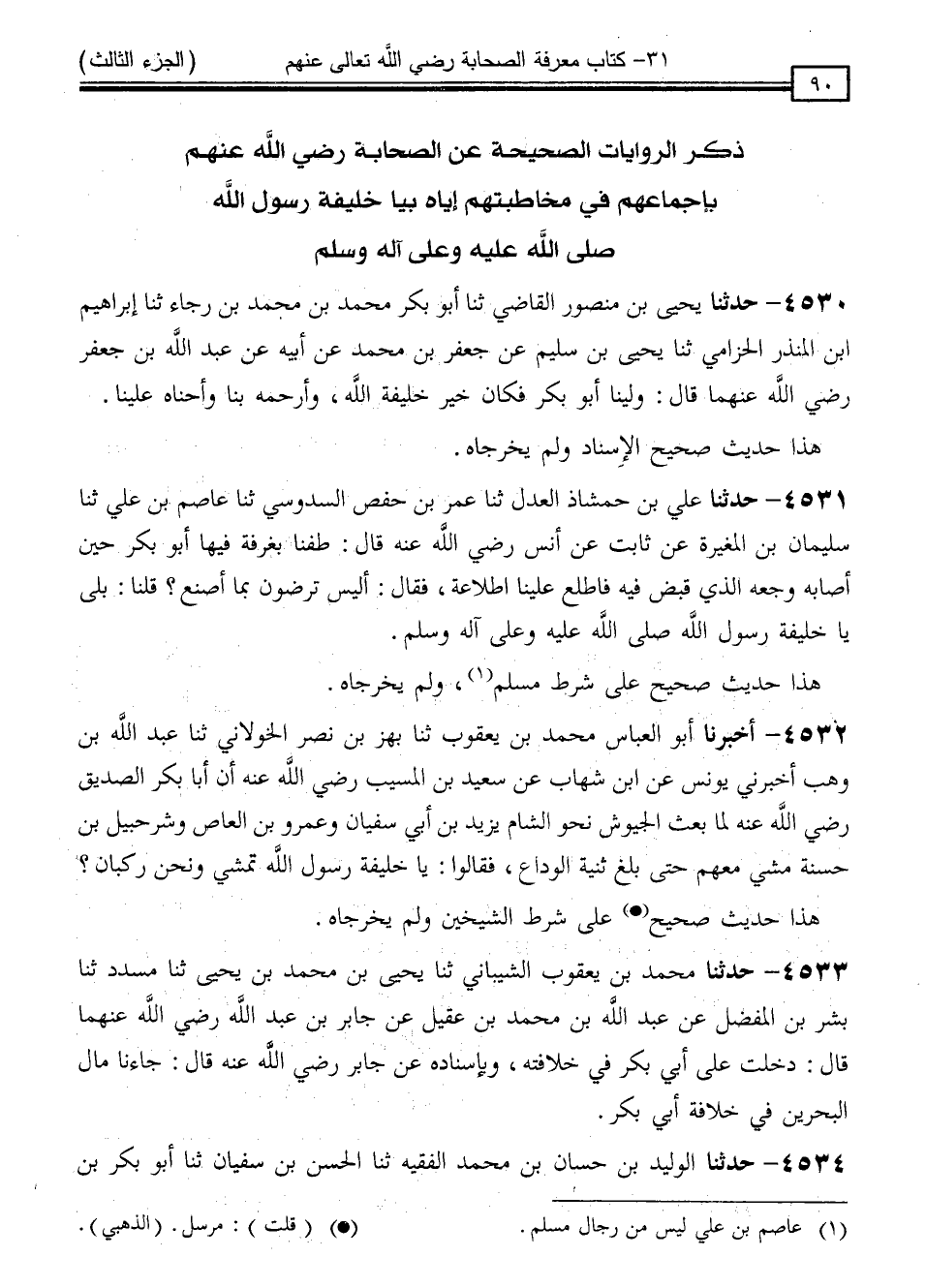 4531 - حَدَّثَنَا عَلِيُّ بْنُ حَمْشَاذَ الْعَدْلُ ، ثنا عُمَرُ بْنُ حَفْصٍ السَّدُوسِيُّ ، ثنا عَاصِمُ بْنُ عَلِيٍّ ، ثنا سُلَيْمَانُ بْنُ الْمُغِيرَةِ ، عَنْ ثَابِتٍ ، عَنْ أَنَسٍ رَضِيَ اللَّهُ عَنْهُمْ قَالَ: طُفْنَا بِغُرْفَةٍ فِيهَا أَبُو بَكْرٍ حِينَ أَصَابَهُ وَجَعُهُ الَّذِي قُبِضَ فِيهِ ، فَاطَّلَعَ عَلَيْنَا اطِّلَاعَةً فَقَالَ: " أَلَيْسَ تَرْضَوْنَ بِمَا أَصْنَعُ ؟ قُلْنَا: بَلَى يَا خَلِيفَةَ رَسُولِ اللَّهِ صَلَّى اللَّهُ عَلَيْهِ وَسَلَّمَ "