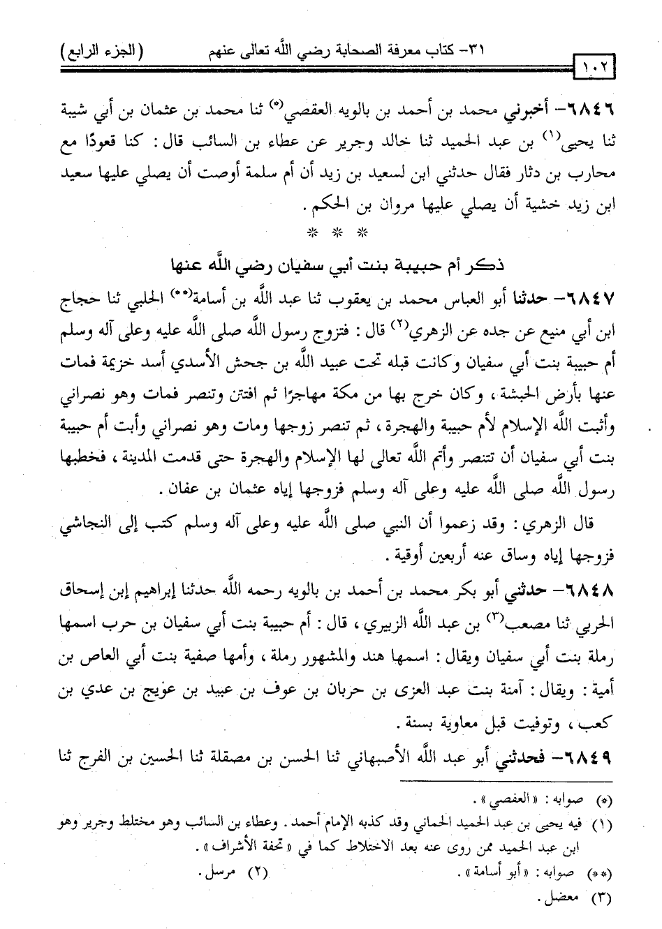6848 - حَدَّثَنِي أَبُو بَكْرٍ مُحَمَّدُ بْنُ أَحْمَدَ بْنِ بَالَوَيْهِ رَحِمَهُ اللَّهُ ، حَدَّثَنَا إِبْرَاهِيمُ بْنُ إِسْحَاقَ الْحَرْبِيُّ ، ثنا مُصْعَبُ بْنُ عَبْدِ اللَّهِ الزُّبَيْرِيُّ ، قَالَ: " أُمُّ حَبِيبَةَ بِنْتُ أَبِي سُفْيَانَ بْنِ حَرْبٍ اسْمُهَا رَمْلَةُ بِنْتُ أَبِي سُفْيَانَ ، وَيُقَالُ: اسْمُهَا هِنْدٌ وَالْمَشْهُورُ رَمْلَةُ ، وَأُمُّهَا صَفِيَّةُ بِنْتُ أَبِي الْعَاصِ بْنِ أُمَيَّةَ ، وَيُقَالُ: آمِنَةُ بِنْتُ عَبْدِ الْعُزَّى بْنِ حَرْبَانَ بْنِ عَوْفِ بْنِ عُبَيْدِ بْنِ عُوَيْجِ بْنِ عَدِيِّ بْنِ كَعْبٍ وَتُوُفِّيَتْ قَبْلَ مُعَاوِيَةَ بِسَنَةٍ "