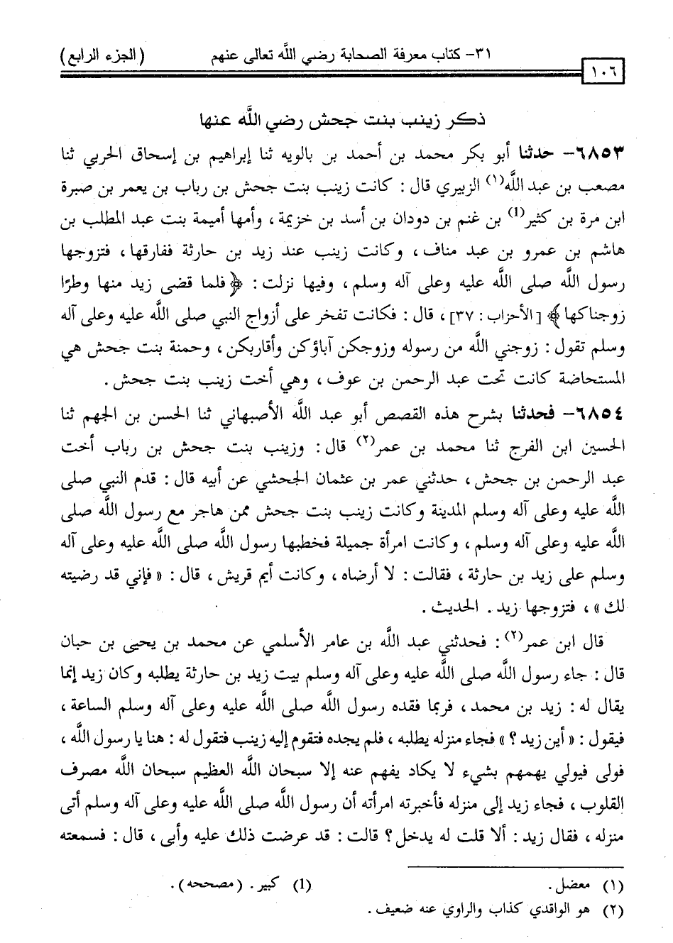 6854 - فَحَدَّثَنَا بِشَرْحِ هَذِهِ الْقِصَصِ أَبُو عَبْدِ اللَّهِ الْأَصْبَهَانِيُّ ، ثنا الْحَسَنُ بْنُ الْجَهْمِ ، ثنا الْحُسَيْنُ بْنُ الْفَرَجِ ، ثنا مُحَمَّدُ بْنُ عُمَرَ ، قَالَ: " وَزَيْنَبُ بِنْتُ جَحْشِ بْنِ رَبَابٍ أُخْتُ عَبْدِ الرَّحْمَنِ بْنِ جَحْشٍ "