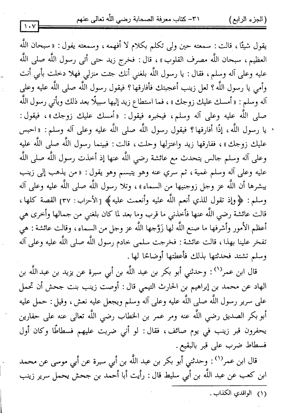 - قَالَ ابْنُ عُمَرَ: وَحَدَّثَنِي أَبُو بَكْرِ بْنُ عَبْدِ اللَّهِ بْنِ أَبِي سَبْرَةَ ، عَنْ يَزِيدَ بْنِ عَبْدِ اللَّهِ بْنِ الْهَادِ ، عَنْ مُحَمَّدِ بْنِ إِبْرَاهِيمَ بْنِ الْحَارِثِ التَّيْمِيِّ ، قَالَ: " أَوْصَتْ زَيْنَبُ بِنْتُ جَحْشٍ ، أَنْ تُحْمَلَ عَلَى سَرِيرِ رَسُولِ اللَّهِ صَلَّى اللَّهُ عَلَيْهِ وَسَلَّمَ وَيُجْعَلَ عَلَيْهِ نَعْشٌ "