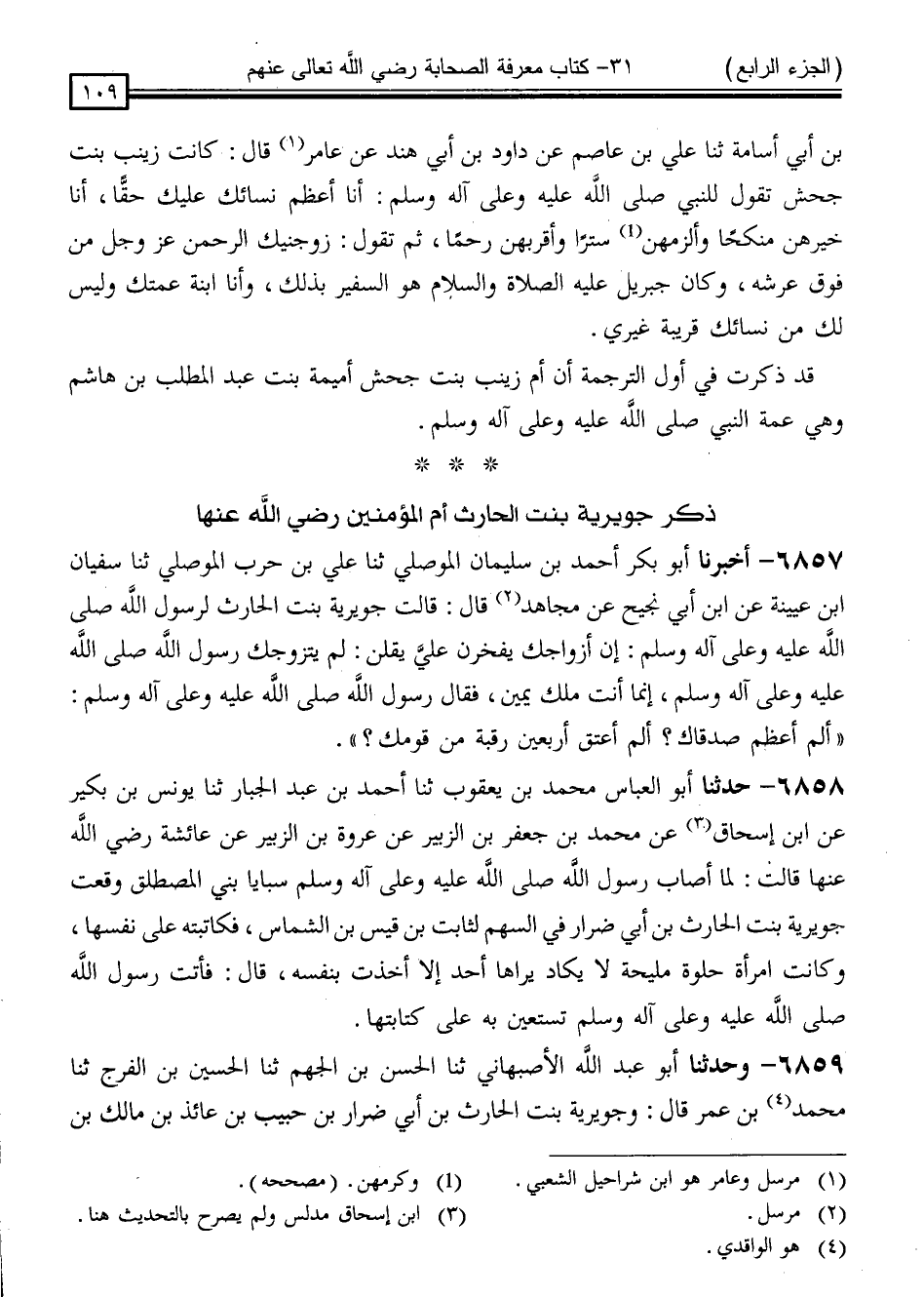 6857 - أَخْبَرَنَا أَبُو بَكْرٍ أَحْمَدُ بْنُ سُلَيْمَانَ الْمَوْصِلِيُّ ، ثنا عَلِيُّ بْنُ حَرْبٍ الْمَوْصِلِيُّ ، ثنا سُفْيَانُ بْنُ عُيَيْنَةَ ، عَنِ ابْنِ أَبِي نَجِيحٍ ، عَنْ مُجَاهِدٍ ، قَالَ: قَالَتْ جُوَيْرِيَةُ بِنْتُ الْحَارِثِ ، لِرَسُولِ اللَّهِ صَلَّى اللَّهُ عَلَيْهِ وَسَلَّمَ: إِنَّ أَزْوَاجَكَ يَفْخَرْنَ عَلَيَّ يَقُلْنَ: لَمْ يَتَزَوَّجْكِ رَسُولُ اللَّهِ صَلَّى اللَّهُ عَلَيْهِ وَسَلَّمَ إِنَّمَا أَنْتِ مِلْكُ يَمِينٍ ، فَقَالَ رَسُولُ اللَّهِ صَلَّى اللَّهُ عَلَيْهِ وَسَلَّمَ: " أَلَمْ أُعَظِّمْ صَدَاقَكِ ، أَلَمْ أُعْتِقَ أَرْبَعِينَ رَقَبَةً مِنْ قَوْمِكِ "