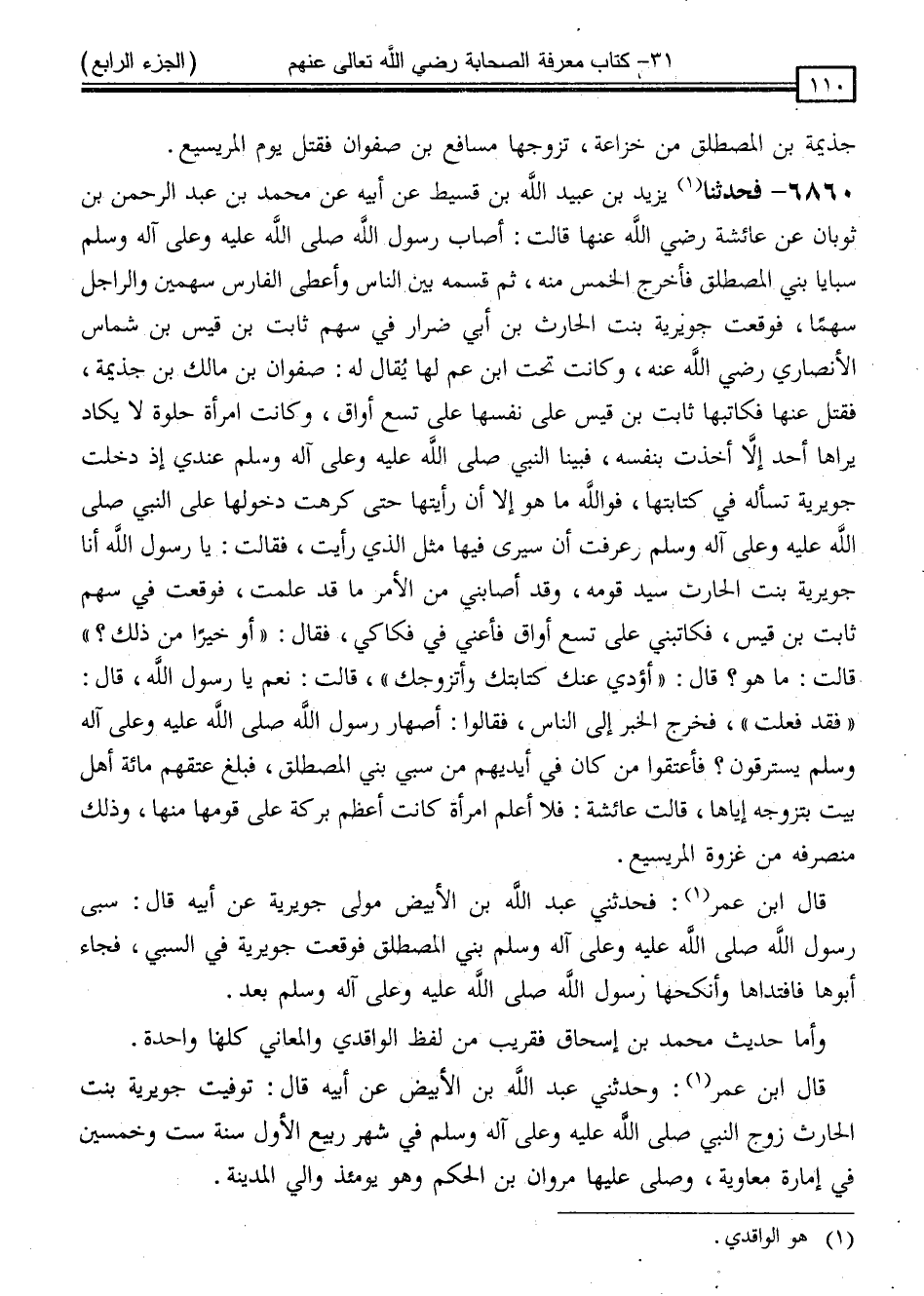 - قَالَ ابْنُ عُمَرَ: فَحَدَّثَنِي عَبْدُ اللَّهِ بْنُ أَبِي الْأَبْيَضِ مَوْلَى جُوَيْرِيَةَ ، عَنْ أَبِيهِ ، قَالَ: " سَبَى رَسُولُ اللَّهِ صَلَّى اللَّهُ عَلَيْهِ وَسَلَّمَ بَنِي الْمُصْطَلِقِ فَوَقَعَتْ جُوَيْرِيَةُ فِي السَّبْيِ ، فَجَاءَ أَبُوهَا فَافْتَدَاهَا ، وَأَنْكَحَهَا رَسُولَ اللَّهِ صَلَّى اللَّهُ عَلَيْهِ وَسَلَّمَ بَعْدُ "